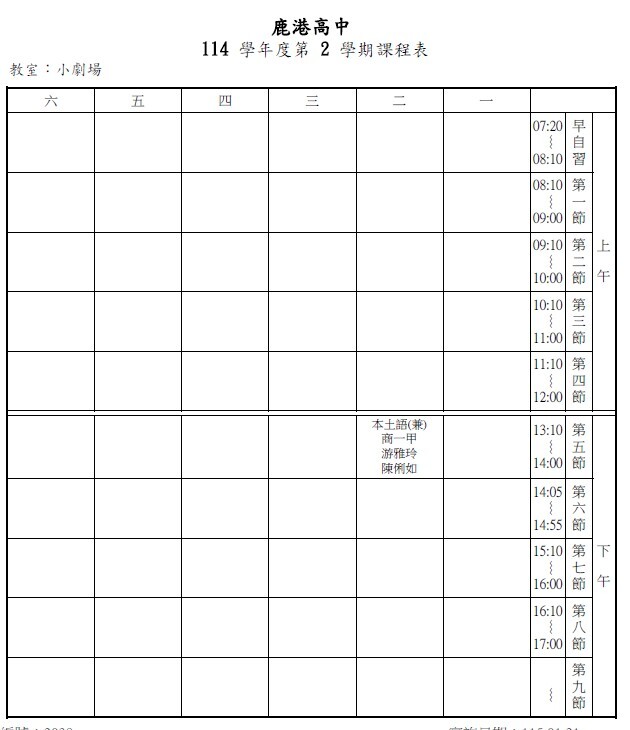 4.本學期教室課表如下,有課時請勿申請借用。下表不含調代課狀況。