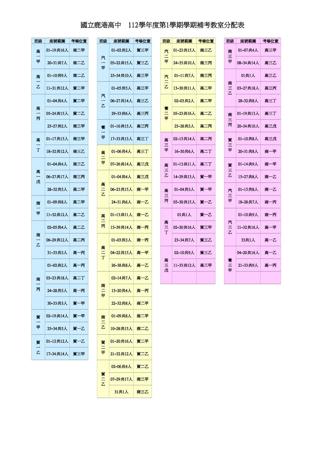 【學期補考重要公告】112學年度第1學期補考座位分配表暨補考注意事項