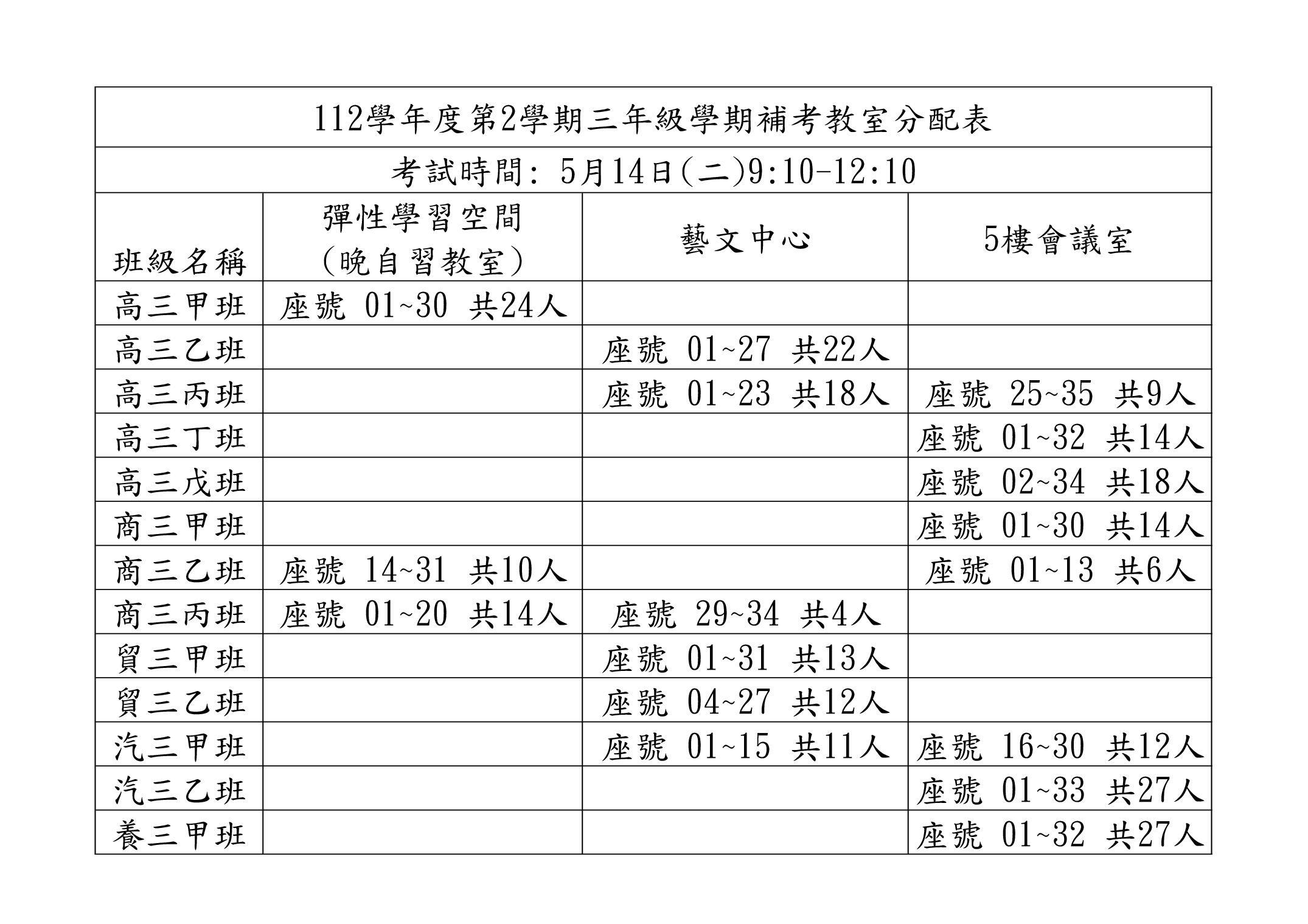 【學期補考公告】112學年度第2學期三年級補考座位分配表暨補考注意事項