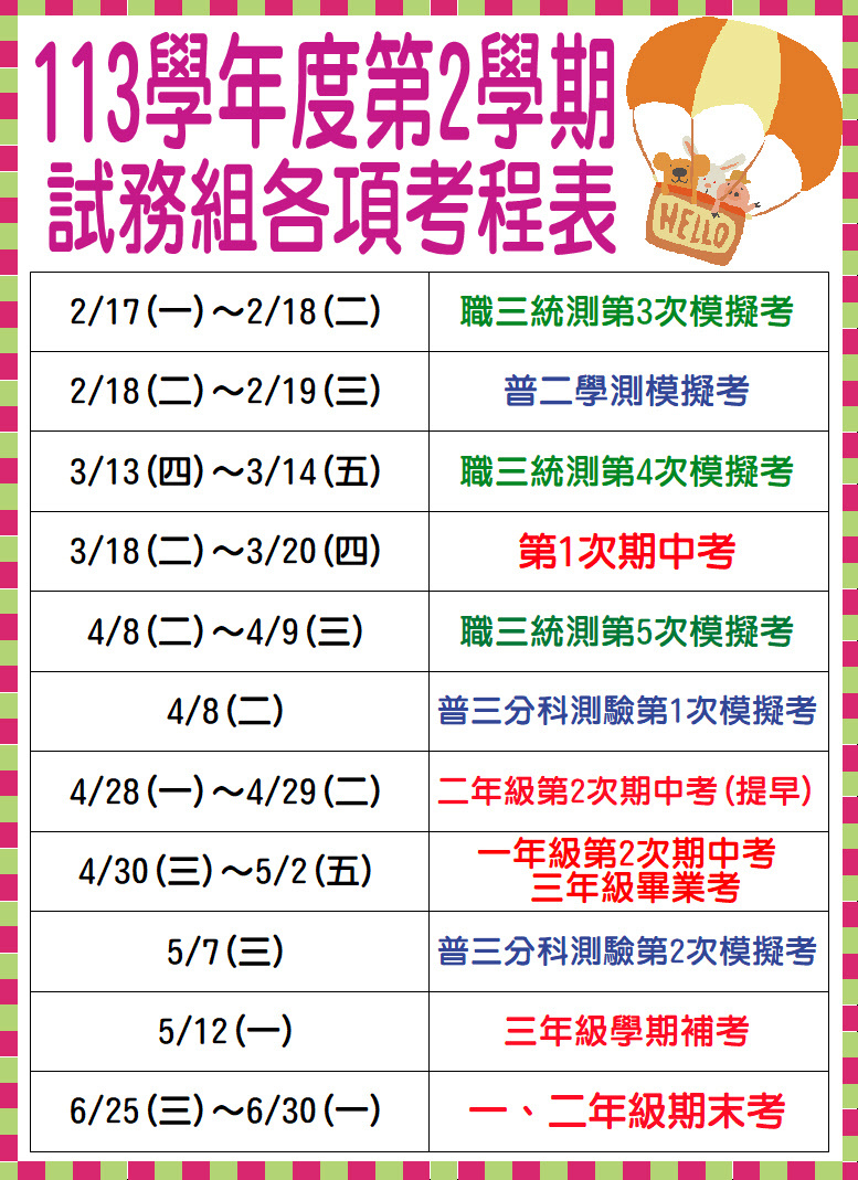 【113-2全校考程規劃】113學年第二學期考試日期一覽表