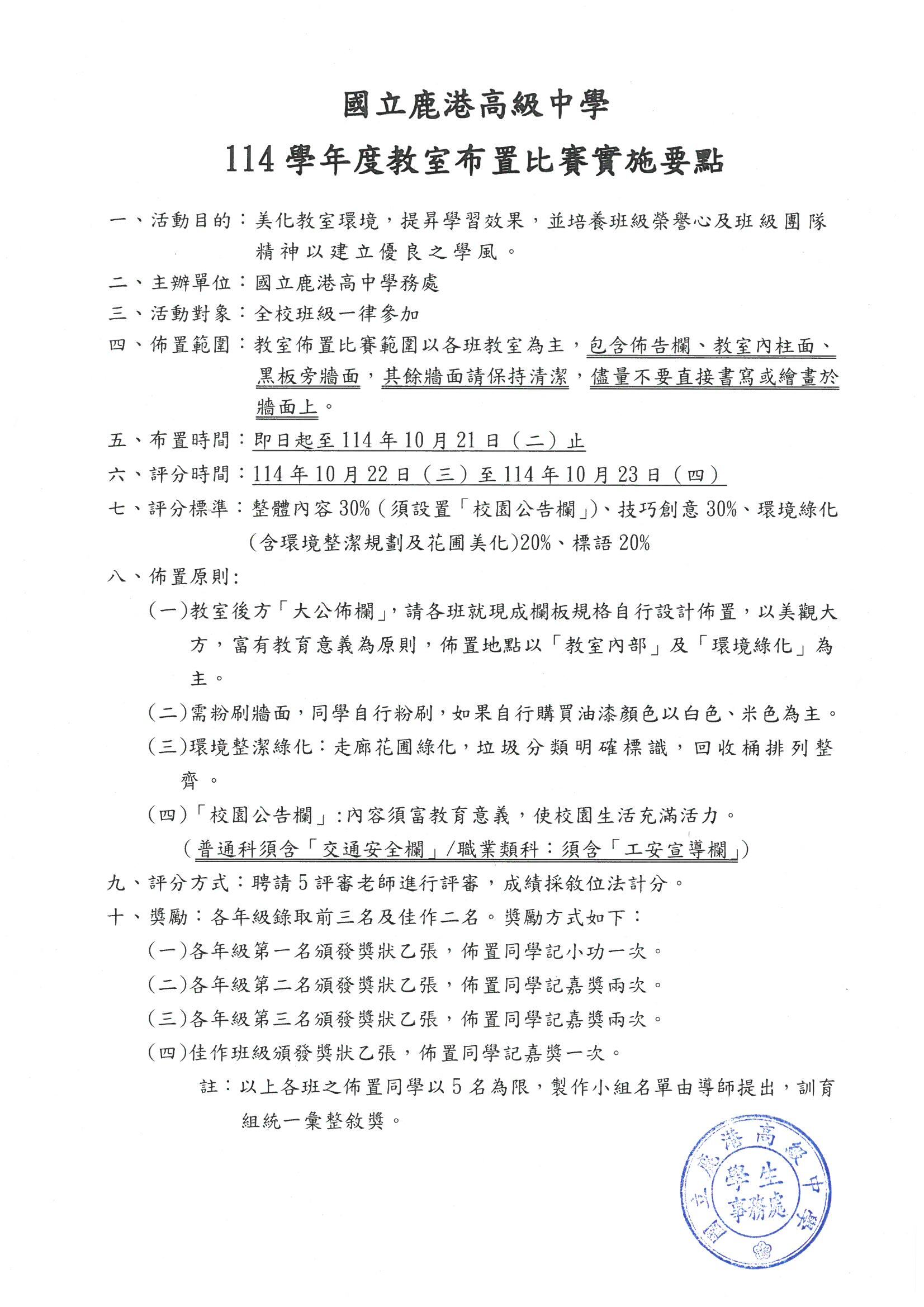 【活動辦法公告】114學年度班級教室布置比賽實施要點