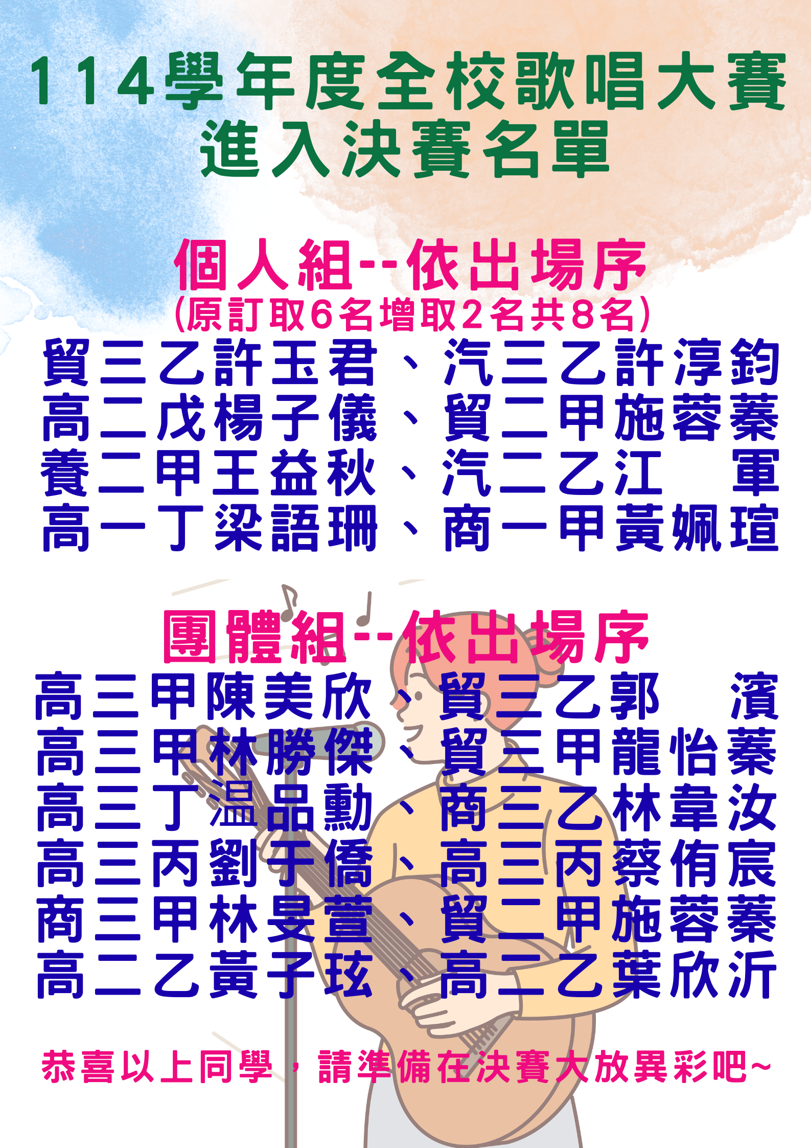 114學年度全校歌唱大賽進入決賽名單