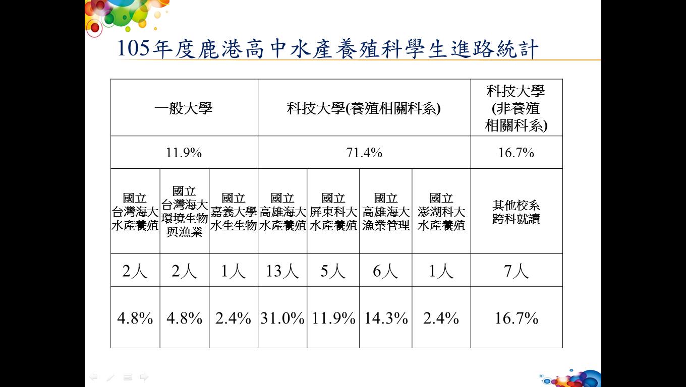 105年度鹿港高中水產養殖科學生升學統計