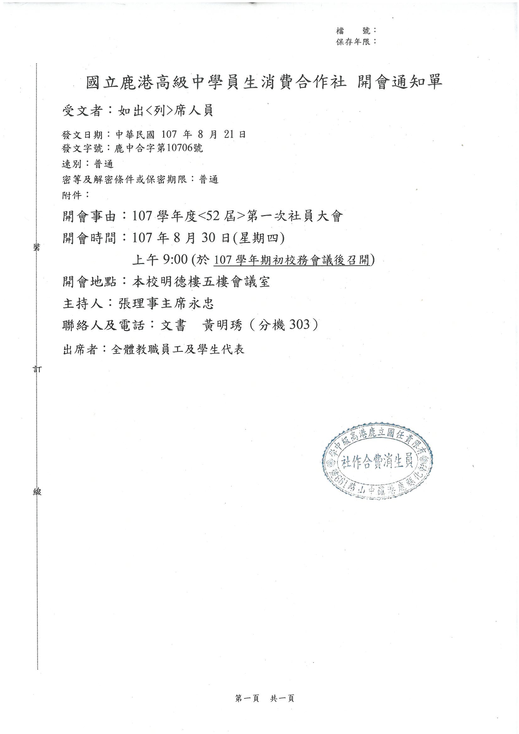 有限責任國立鹿港高中員生消費合作社107學年度第52屆第一次社員大會會議通知