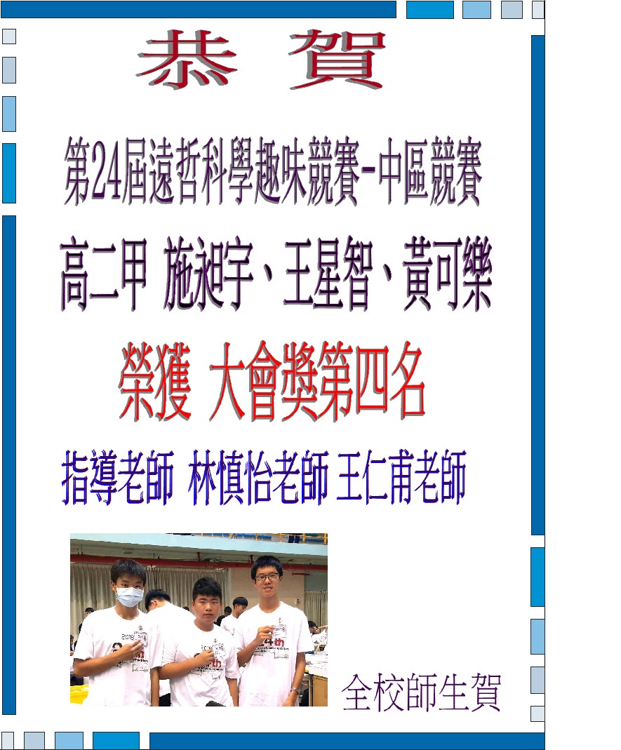 賀!!107學年度-第24屆遠哲科學趣味競賽中區賽 林慎怡老師、王仁甫老師指導施昶宇、王星智、黃可樂同學參加科學競賽 榮獲第四名
