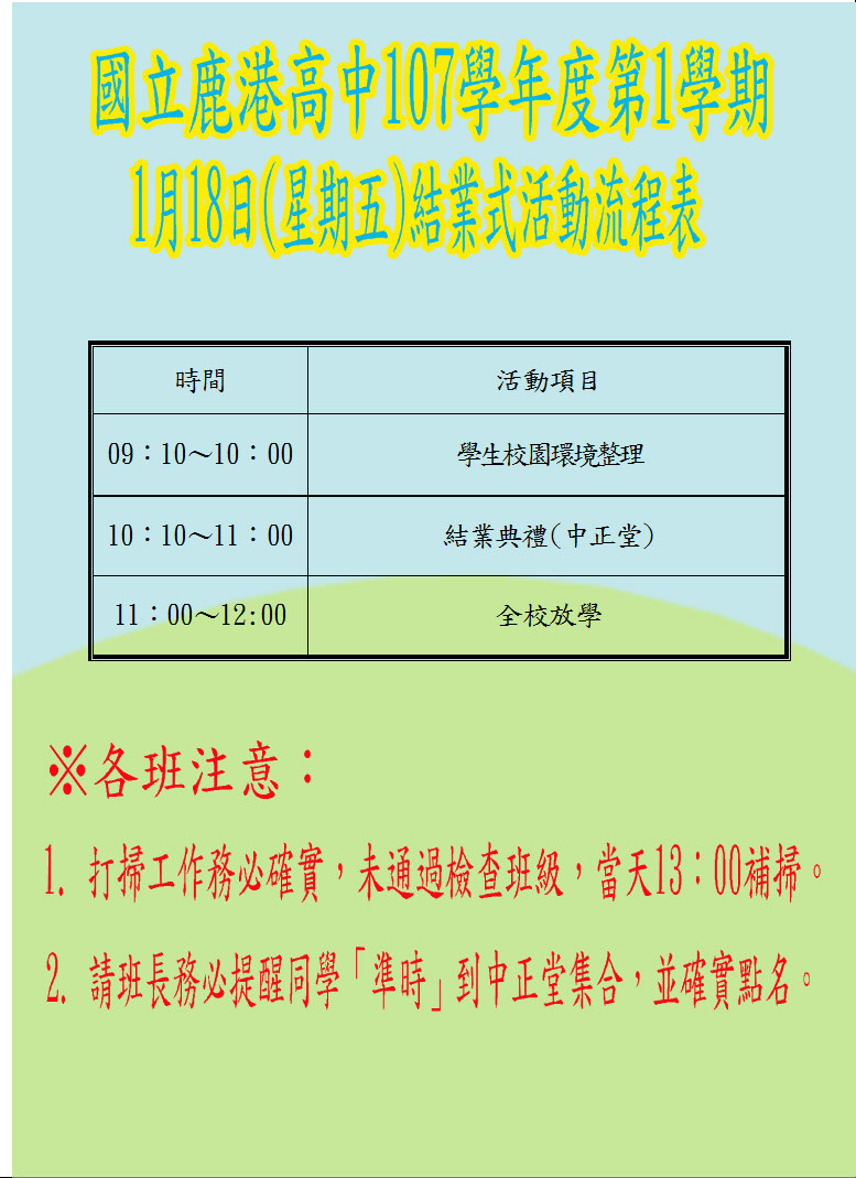 107學年度第1學期1月18日(星期五)結業式活動流程表。