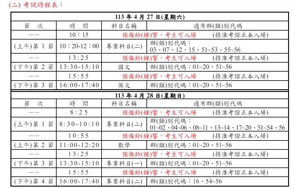 一、113學年度四技二專統一入學測驗訂於113年4月27日、4月28日(星期六、日)舉行,各節考試科目、時間請參閱簡章。