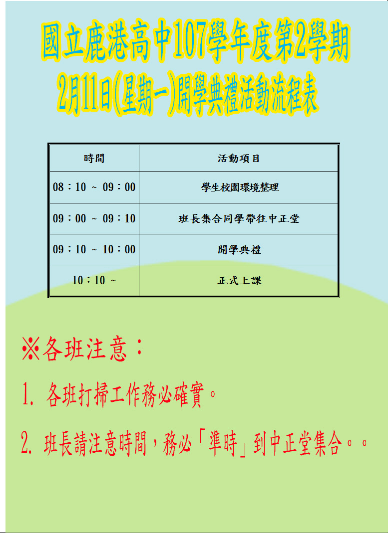 107學年度第2學期2月11日(星期一)開學典禮活動流程表
