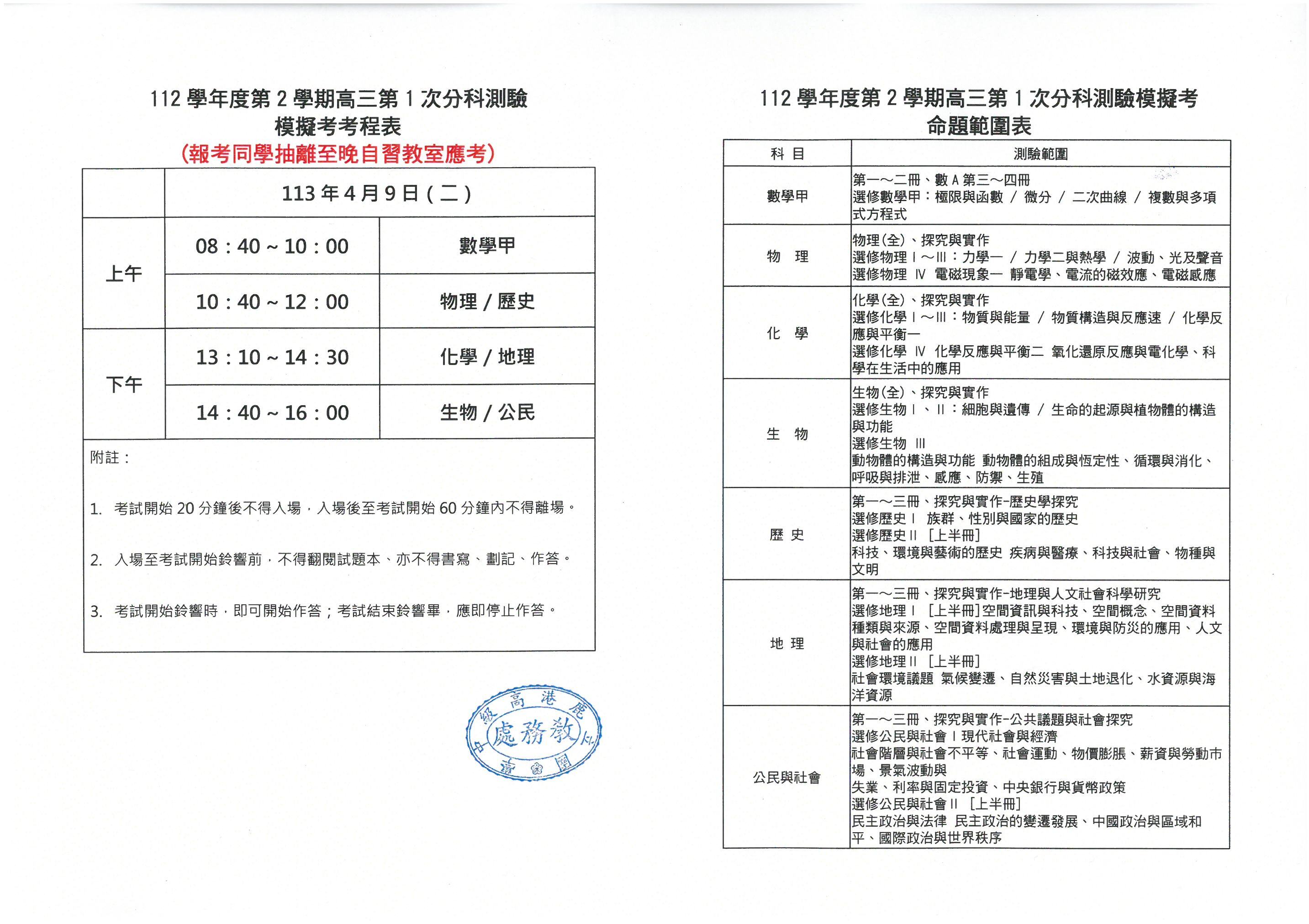【試務組-普三分科測驗模擬考公告】普三分科測驗第1次模擬考(4/9)考程表
