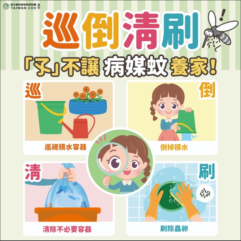 為防範登革熱流行,請持續落實孳生源清除及環境整頓工作,並掌握執行成果