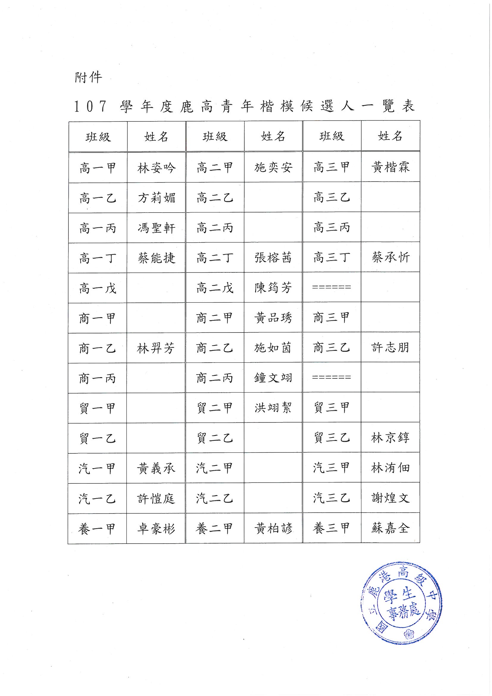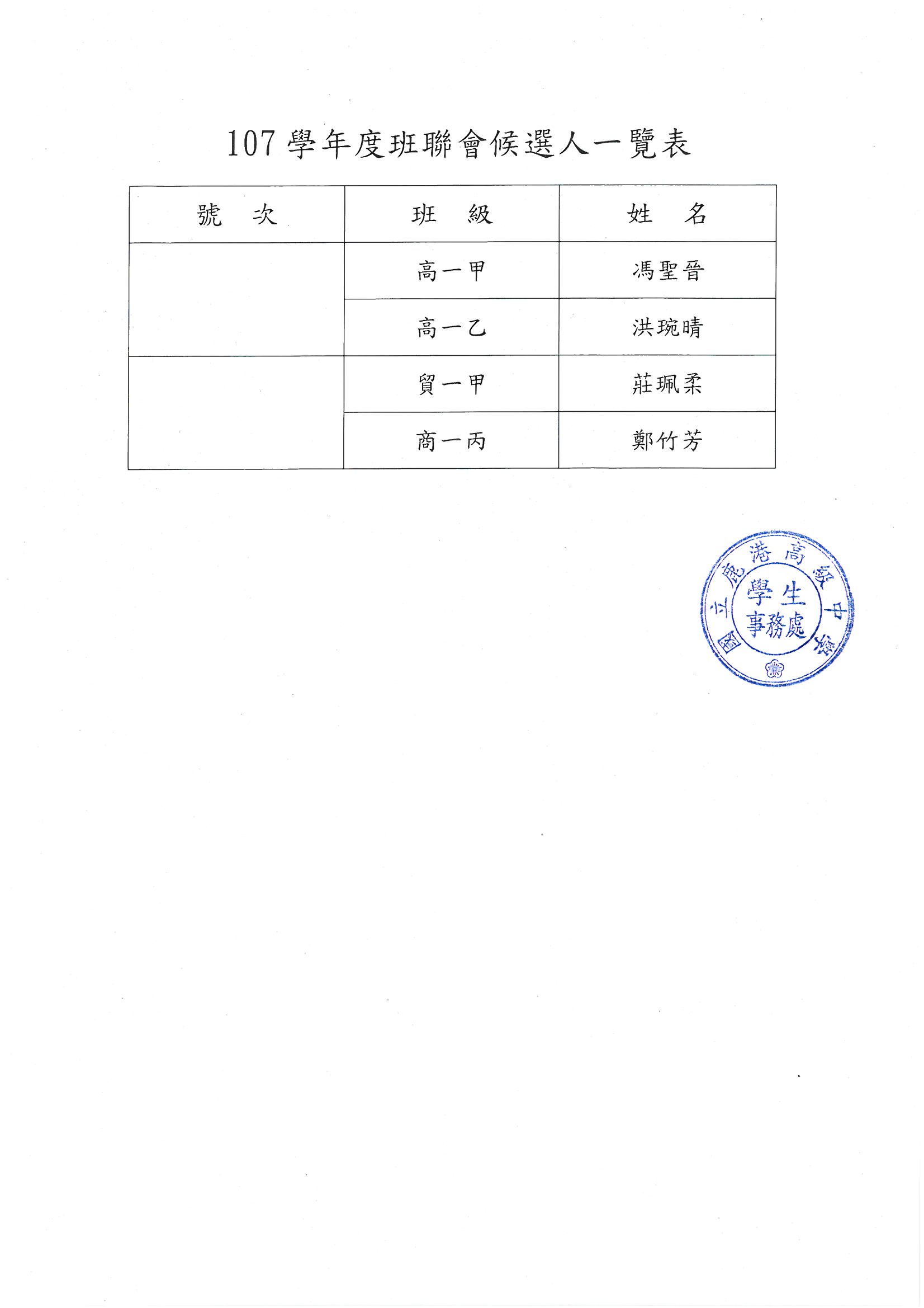 請以下候選人於3月18日(星期一)中午12:30到學務處進行號次抽籤