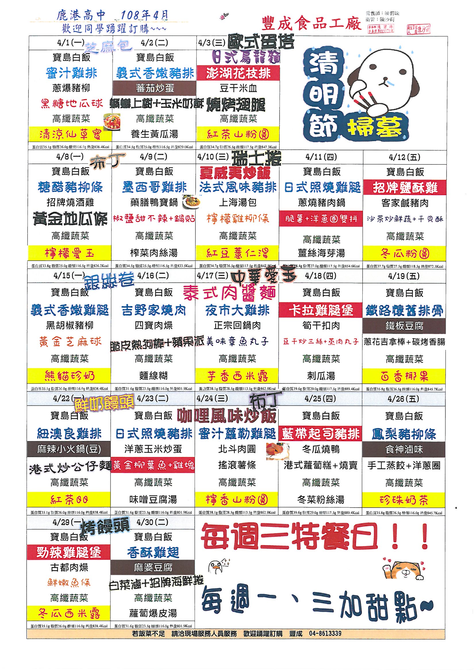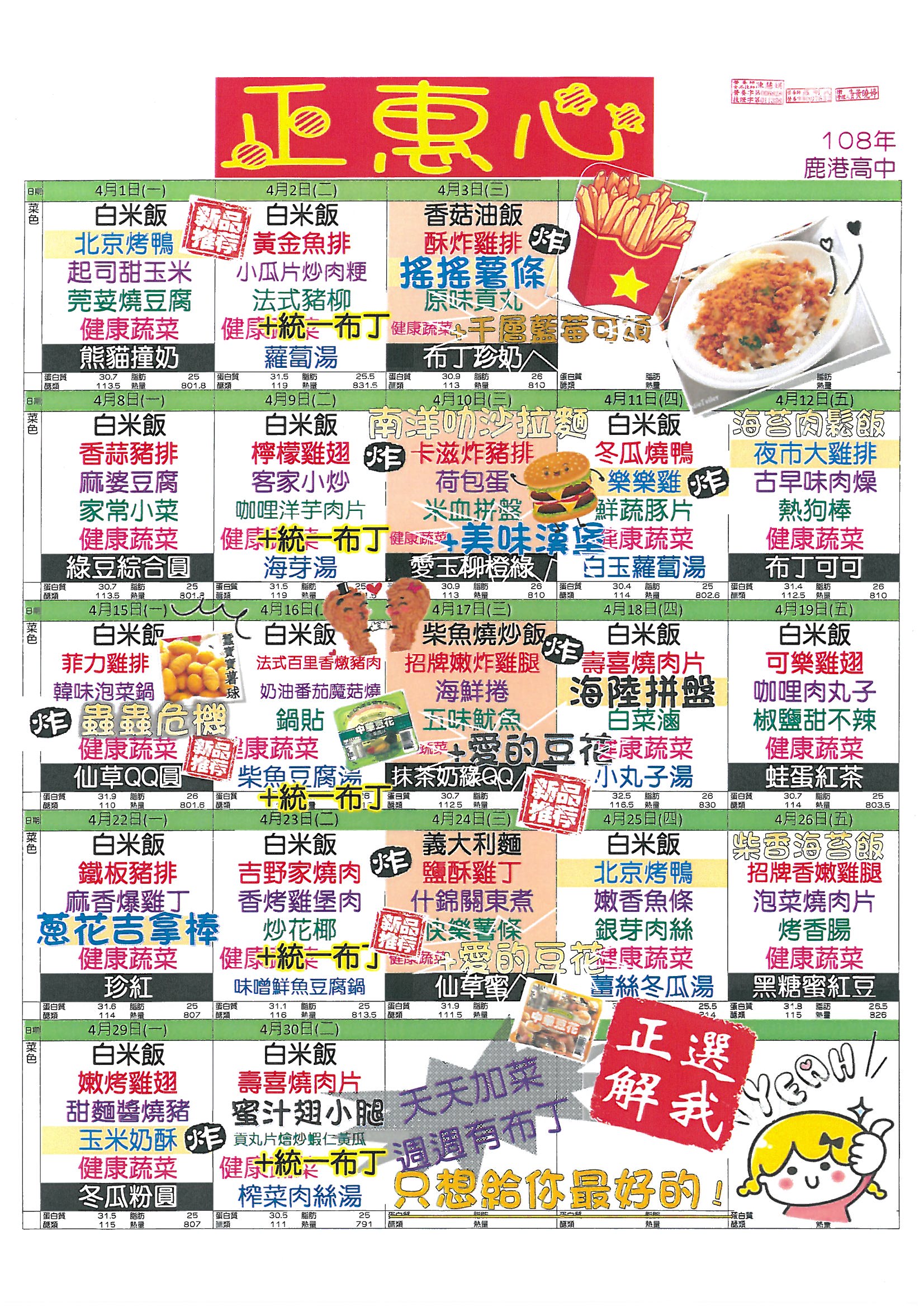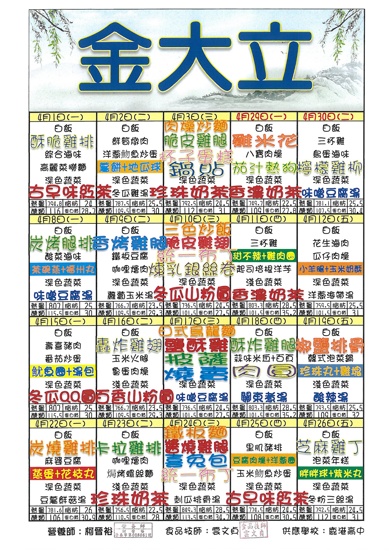 鹿港高中108年4月團膳菜單