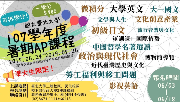 【轉知】國立臺北大學開設108暑期大學先修課程