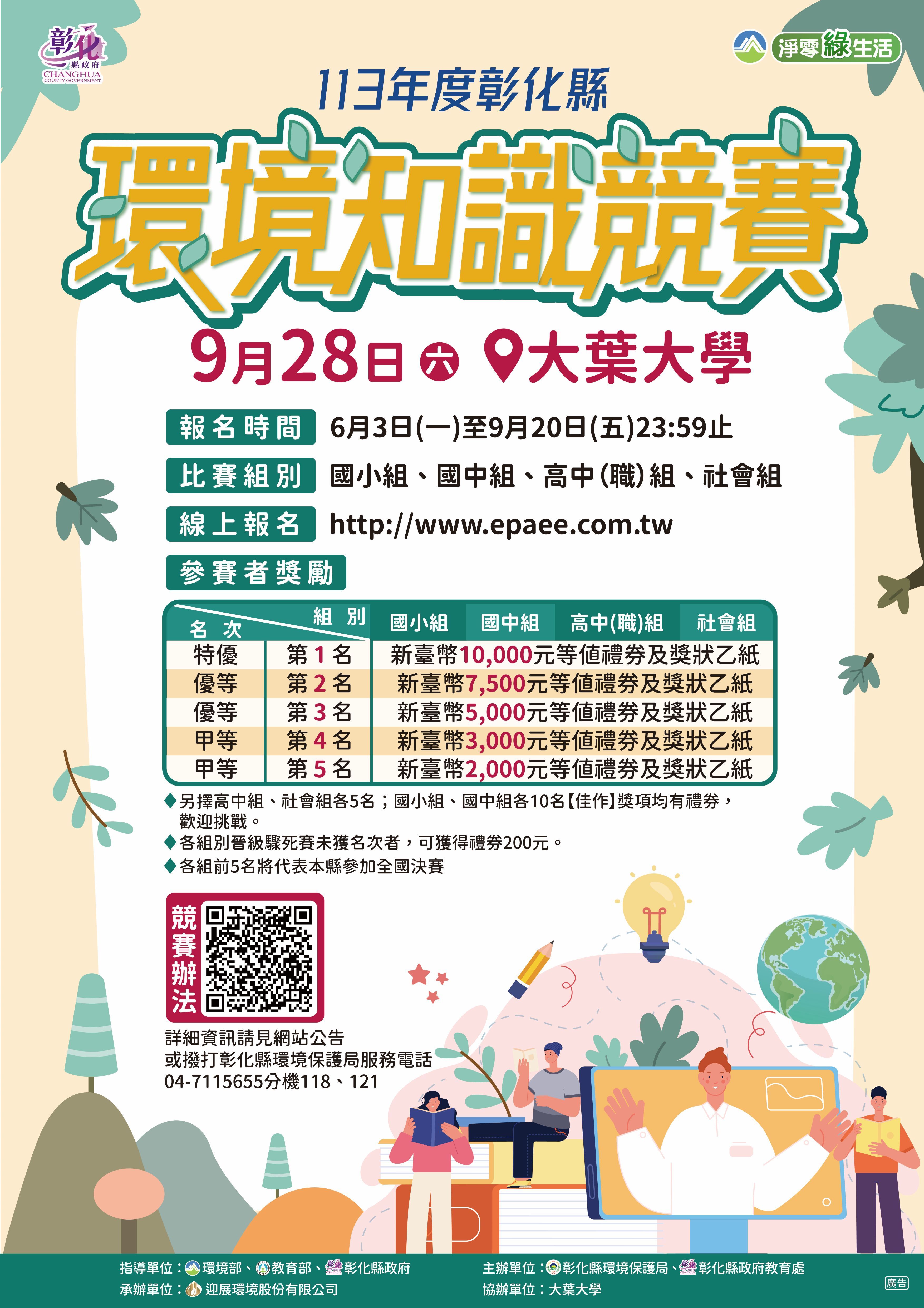 彰化縣環境保護局將於113年9月28日(星期六)舉辦「113年彰化縣環境知識競賽」,鼓勵師生踴躍報名參加