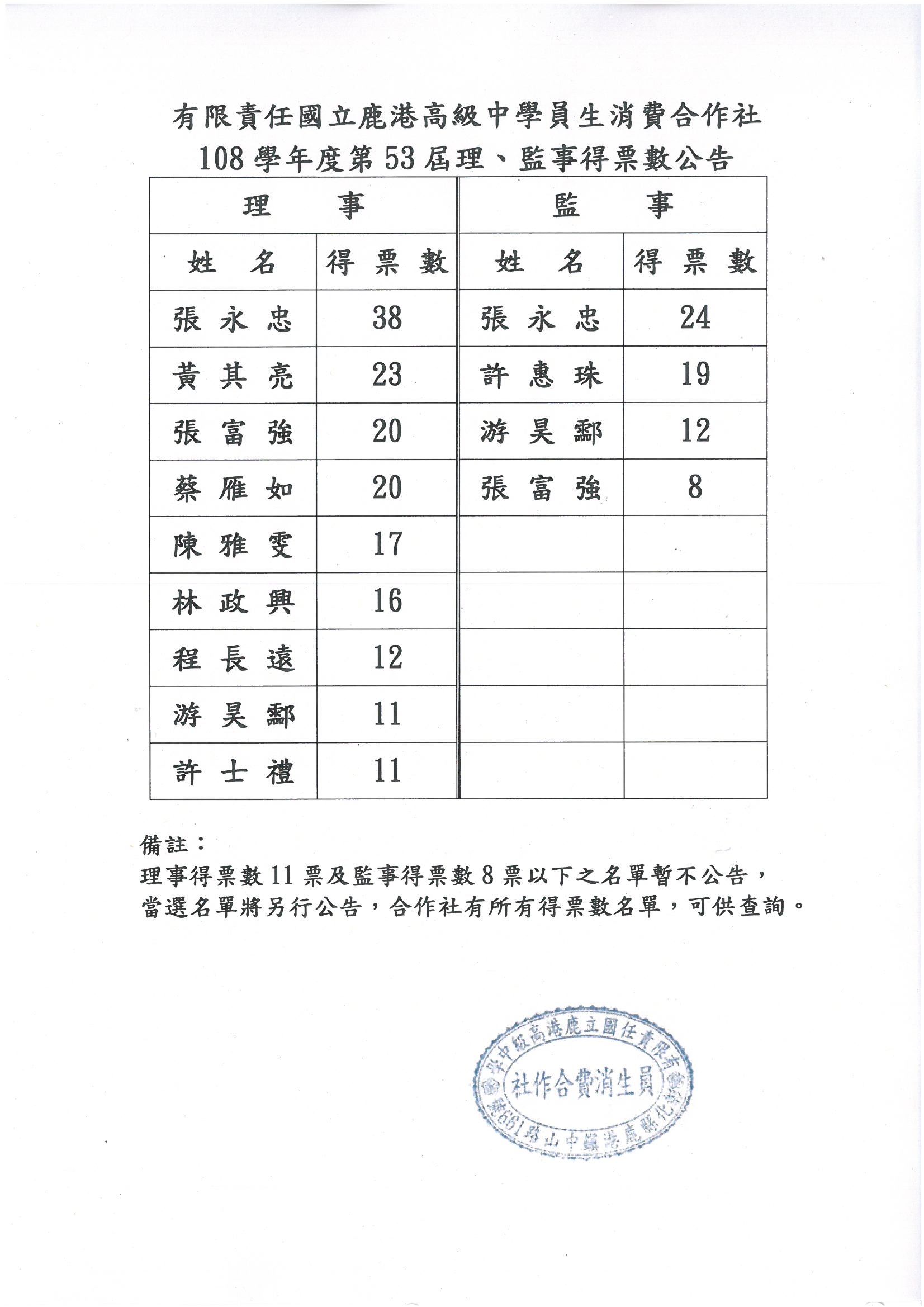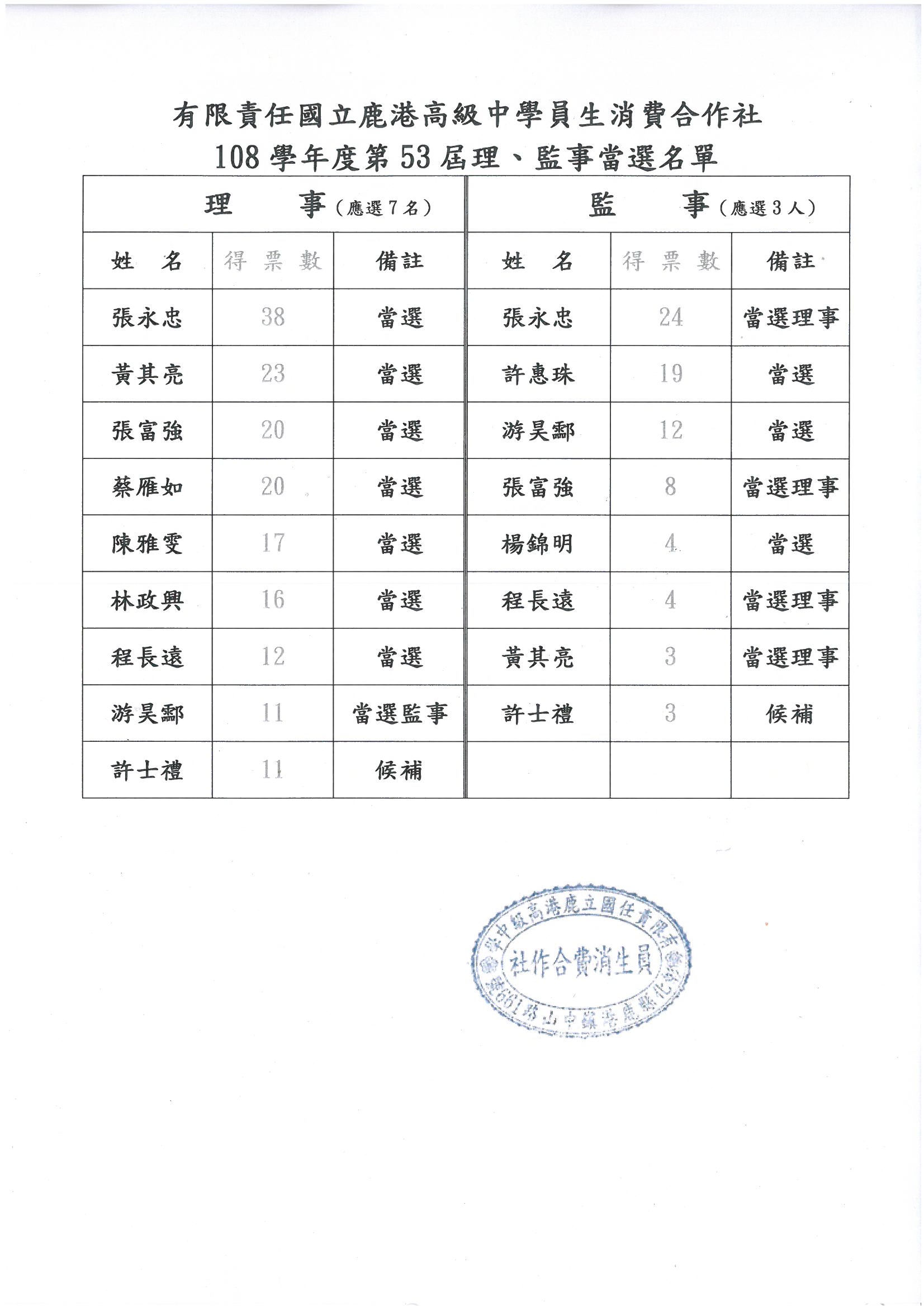 有限責任國立鹿港高級中學員生消費合作社第53屆理監事得票數公告