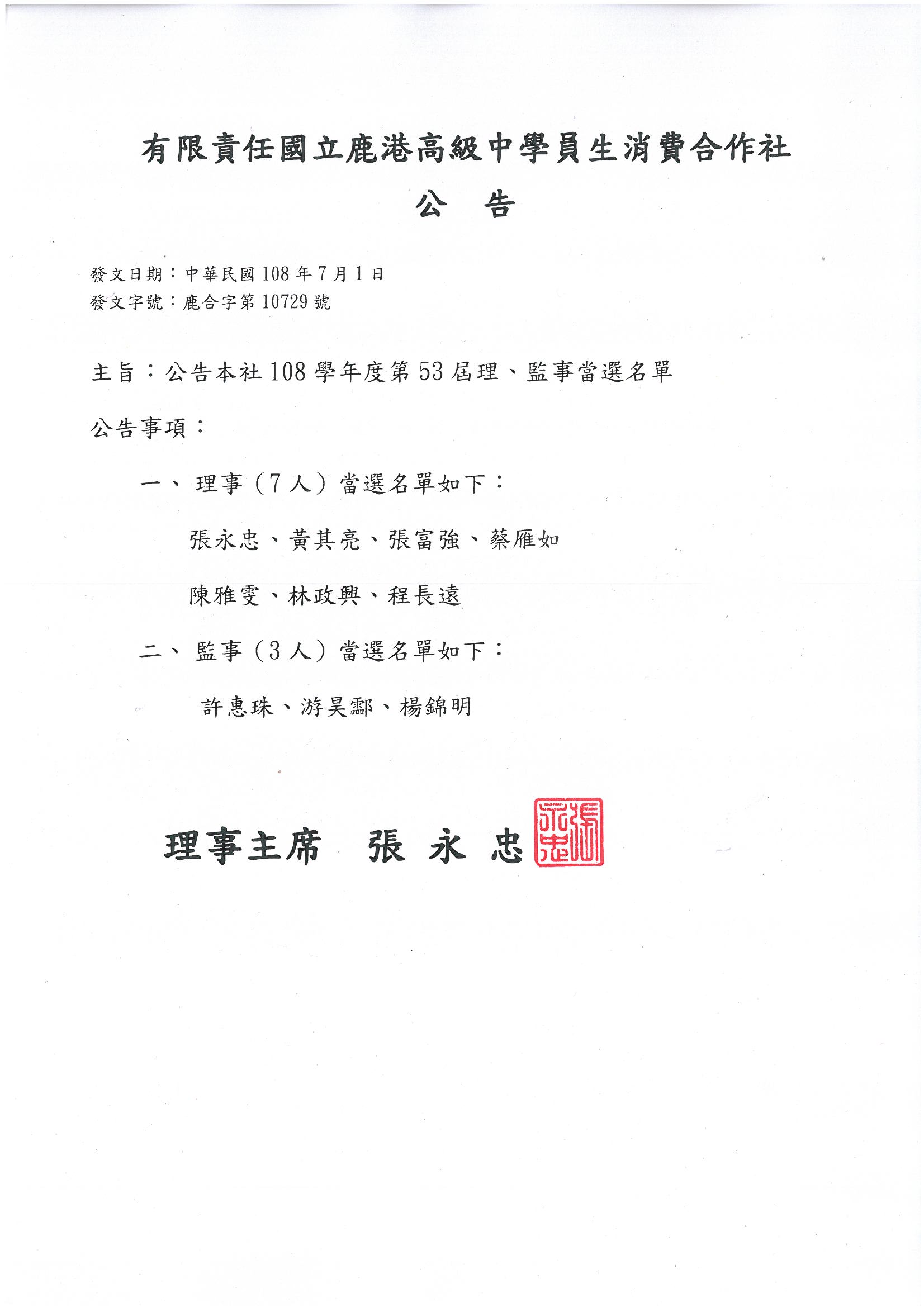 公告-有限責任國立鹿港高級中學員生消費合作社第53屆理監事當選名單