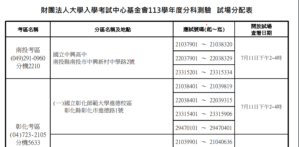 【公告】113學年度分科測驗應試資訊與相關注意事項-考場及試場配置圖