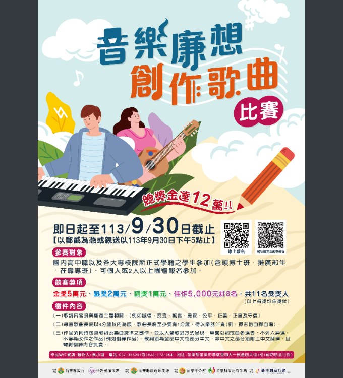 苗栗縣政府113年辦理「音樂廉想」創作歌曲比賽活動,歡迎學生踴躍報名參加
