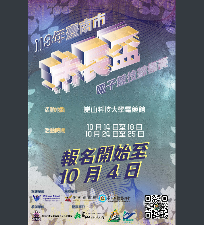 二、比賽辦法:(一)參賽對象:15歲以上高中職及大專院校之在校生。(二)報名時間:即日起至113年10月4日(星期五)。(三)賽程表公布日期:113年10月7日(星期一)。(四)預賽時程:113年10月14(星期一)日至18日(星期五)。(五)決賽日期:113年10月24日(星期四)至10月25日(星期五)。(六)決賽地點:崑山科技大學民生二館8樓電競館(台南市永康區崑大路 195 號)。