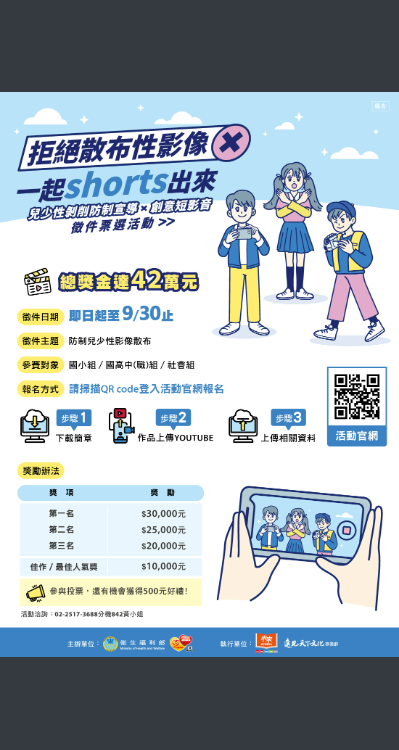 衛生福利部辦理「拒絕散布性影像 一起shorts出來」創意短影音徵件活動,歡迎師生、家長踴躍報名參加