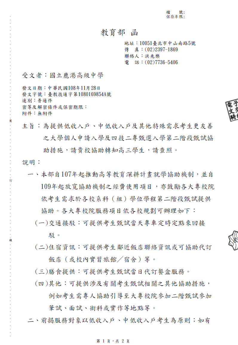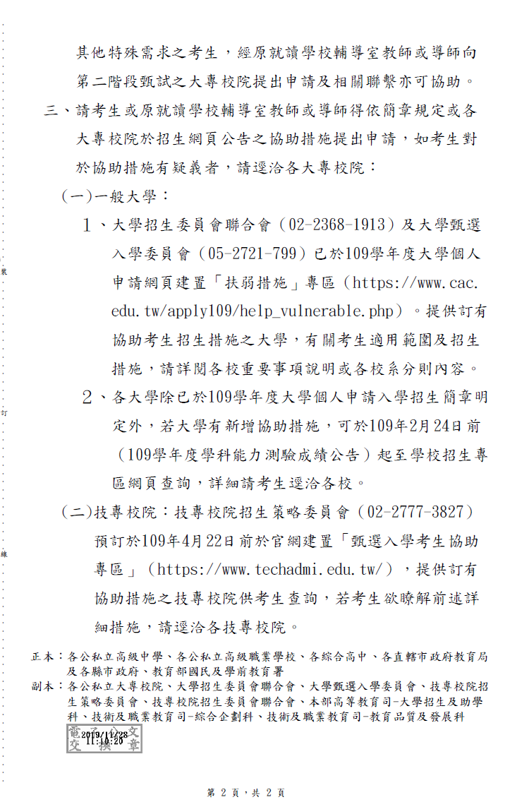【轉知】109學年度大學個人申請及四技二專甄選入學二階扶弱措施