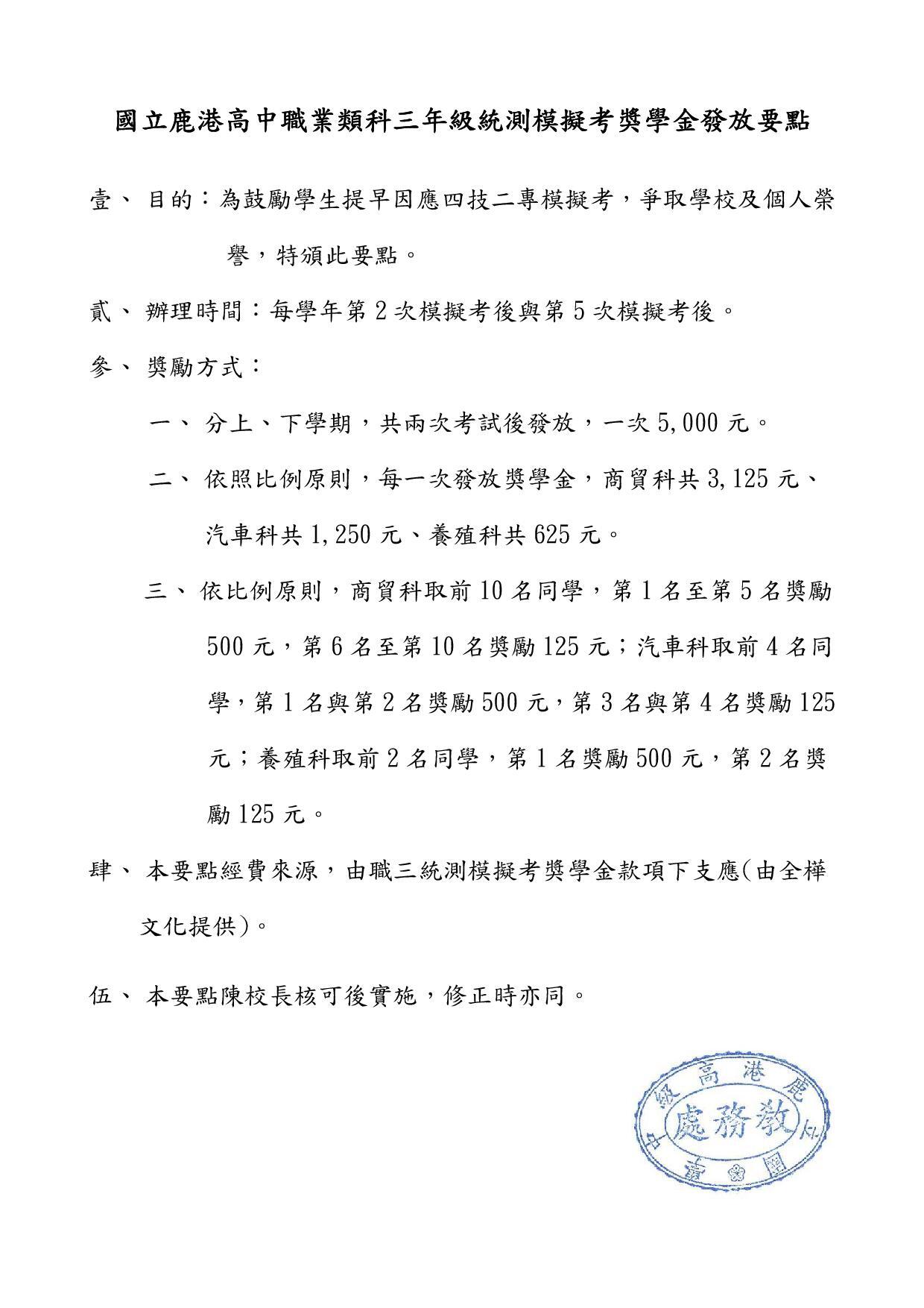 國立鹿港高中職業類科三年級統測模擬考獎學金發放要點