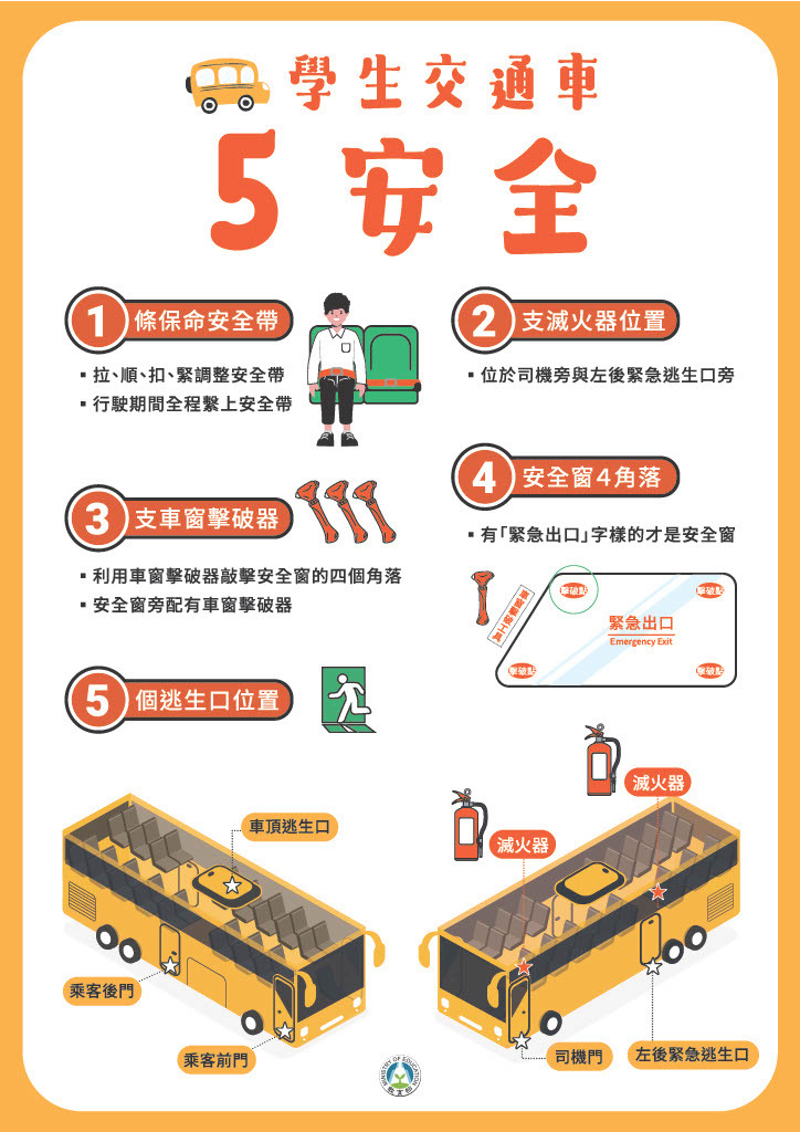 一、依教育部113年9月24日臺教社(一)字第1130090139A號函辦理。 二、為提高學生搭乘交通車之安全意識及危機應變能力,教育部委請國立臺灣師範大學製作學生交通車教育訓練教材、 教學影片及圖卡,供學校實施交通安全教育使用,請貴校於各項集會、課程或其他多元管道宣導時多加運用,以提 升交通安全知能。