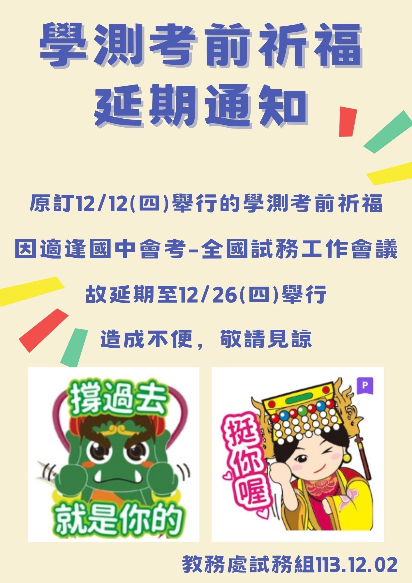 【普三同學請注意】校內學測考前祈福延期至12/26舉行