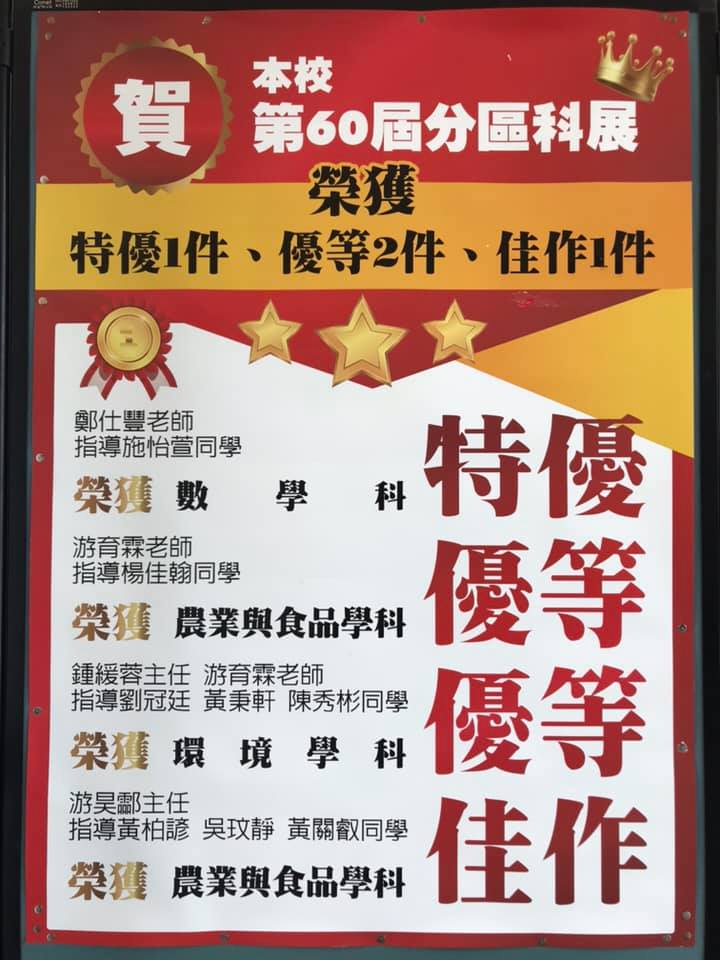 賀!! 本校第60屆分區科展榮獲特優一件、優等兩件、佳作一件