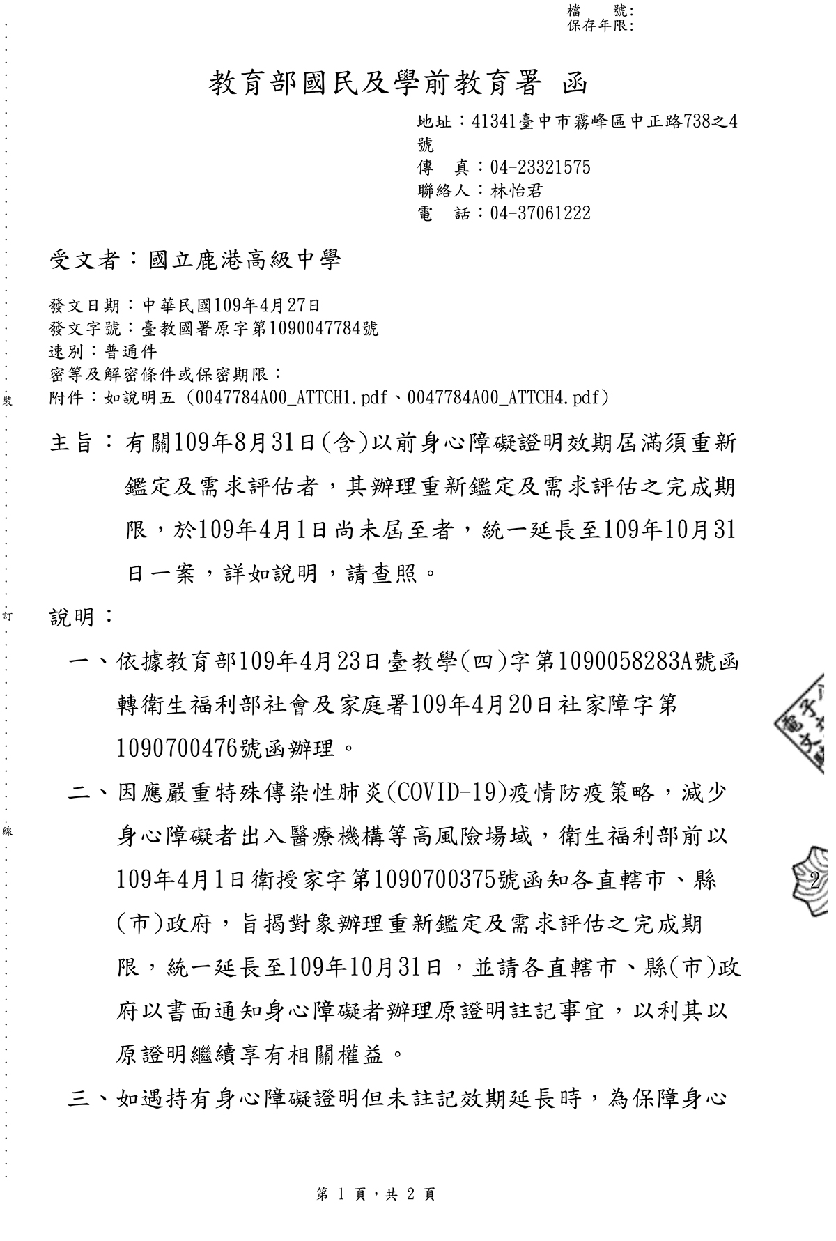 有關109年8月31日(含)以前身心障礙證明效期屆滿須重新鑑定及需求評估者,其辦理重新鑑定及需求評估之完成期限,於109年4月1日尚未屆至者,統一延長至109年10月31日。