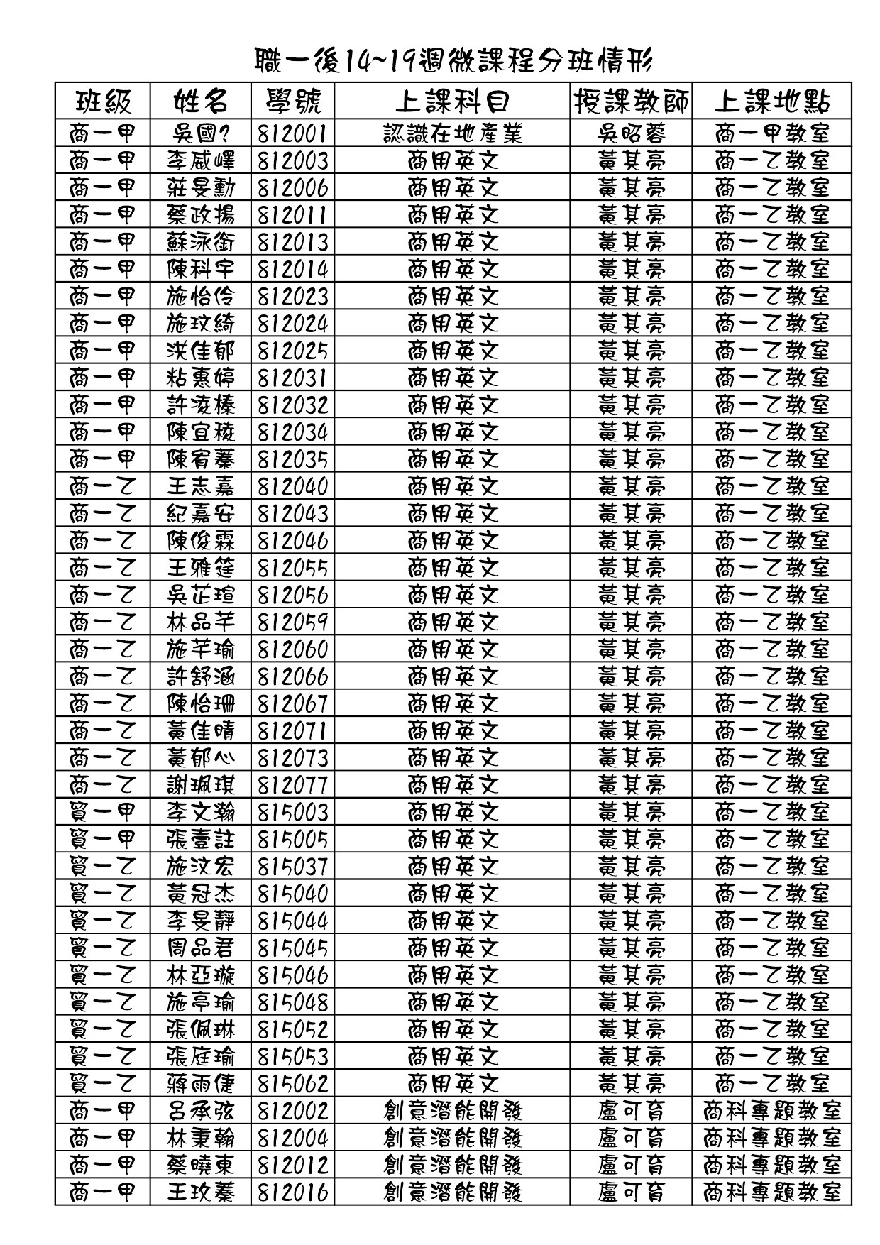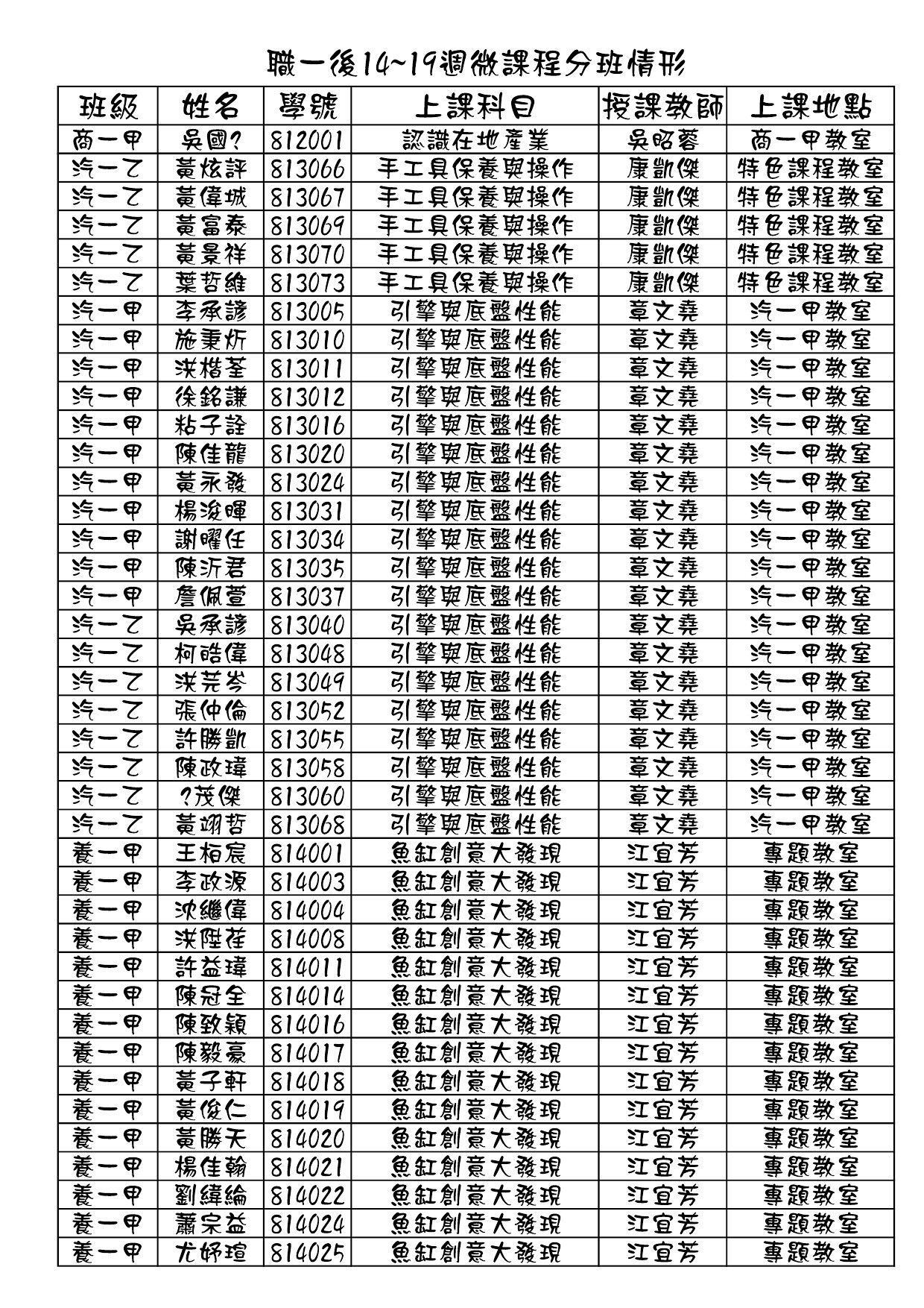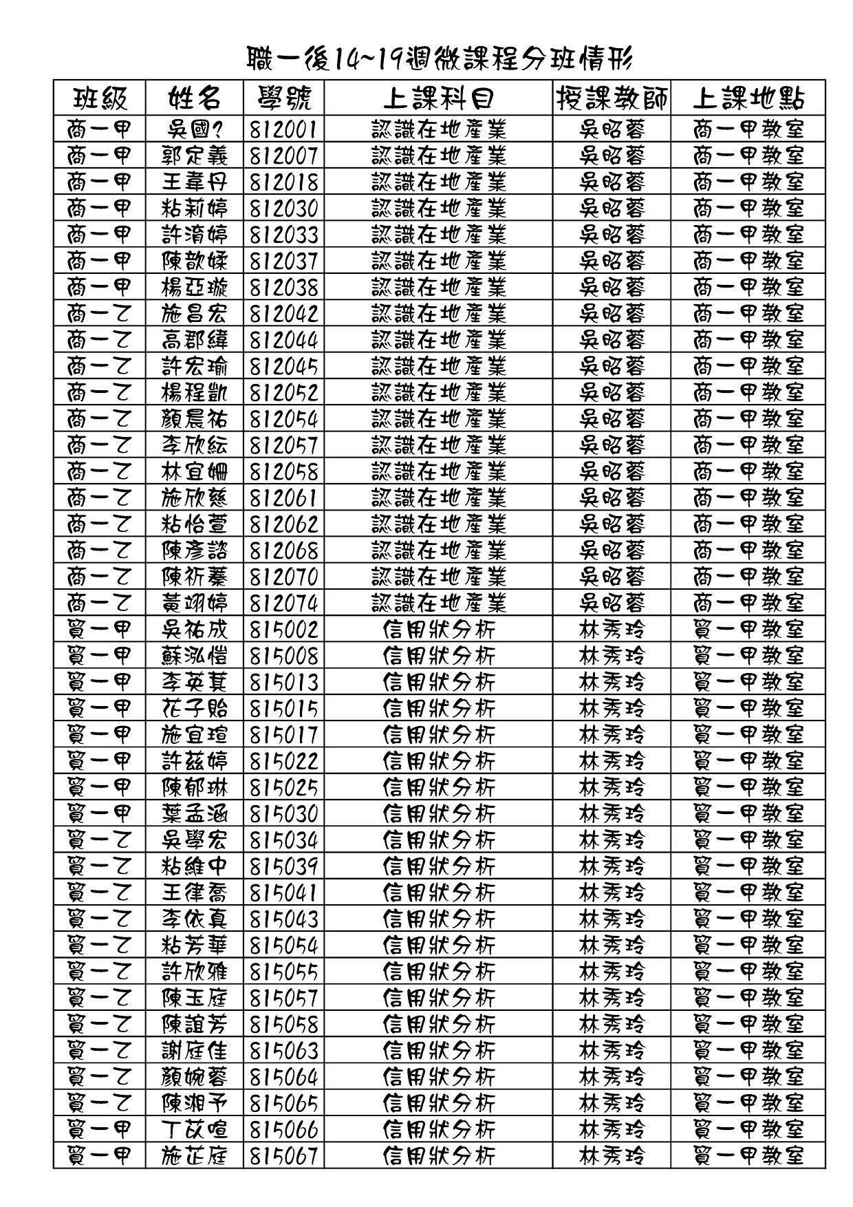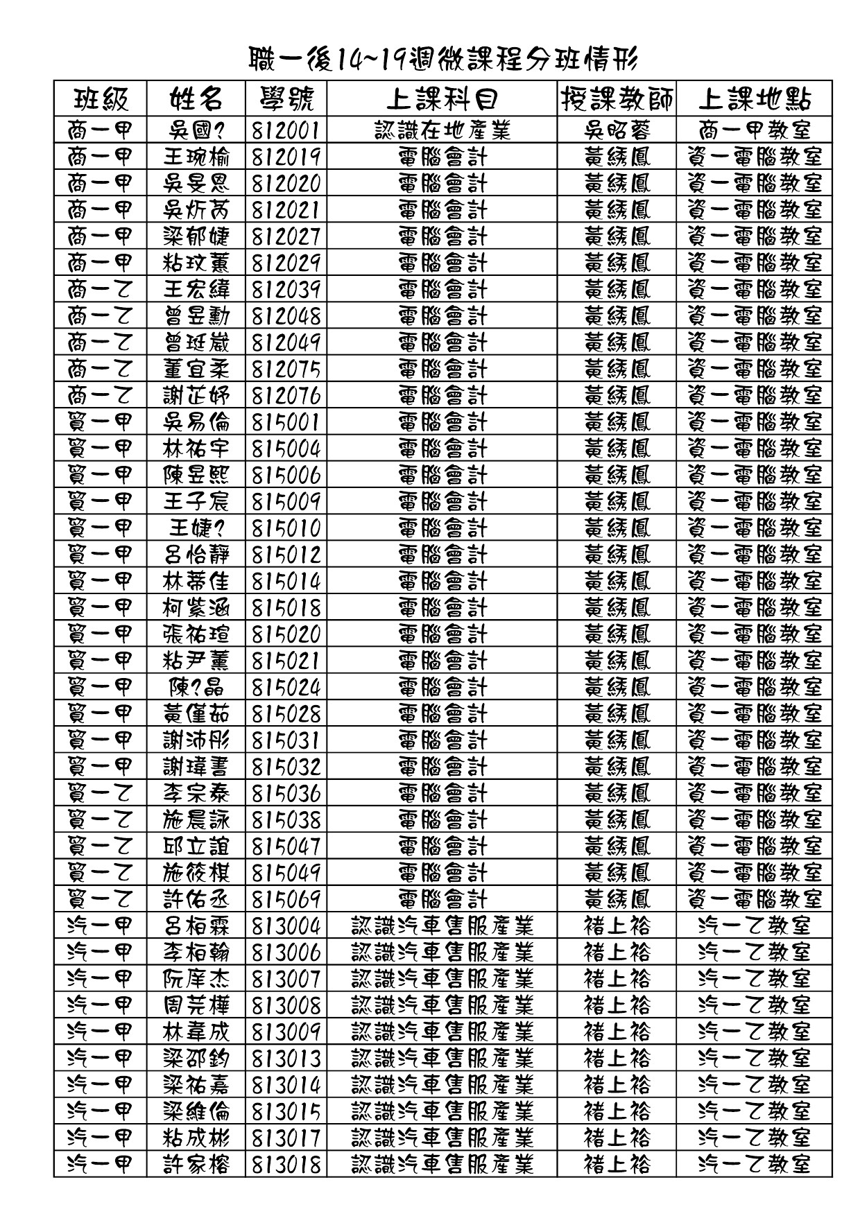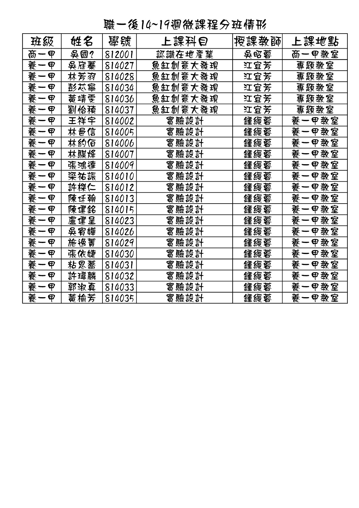 108學年度第二學期職一微課程第二階段分班結果<第14~第19周>