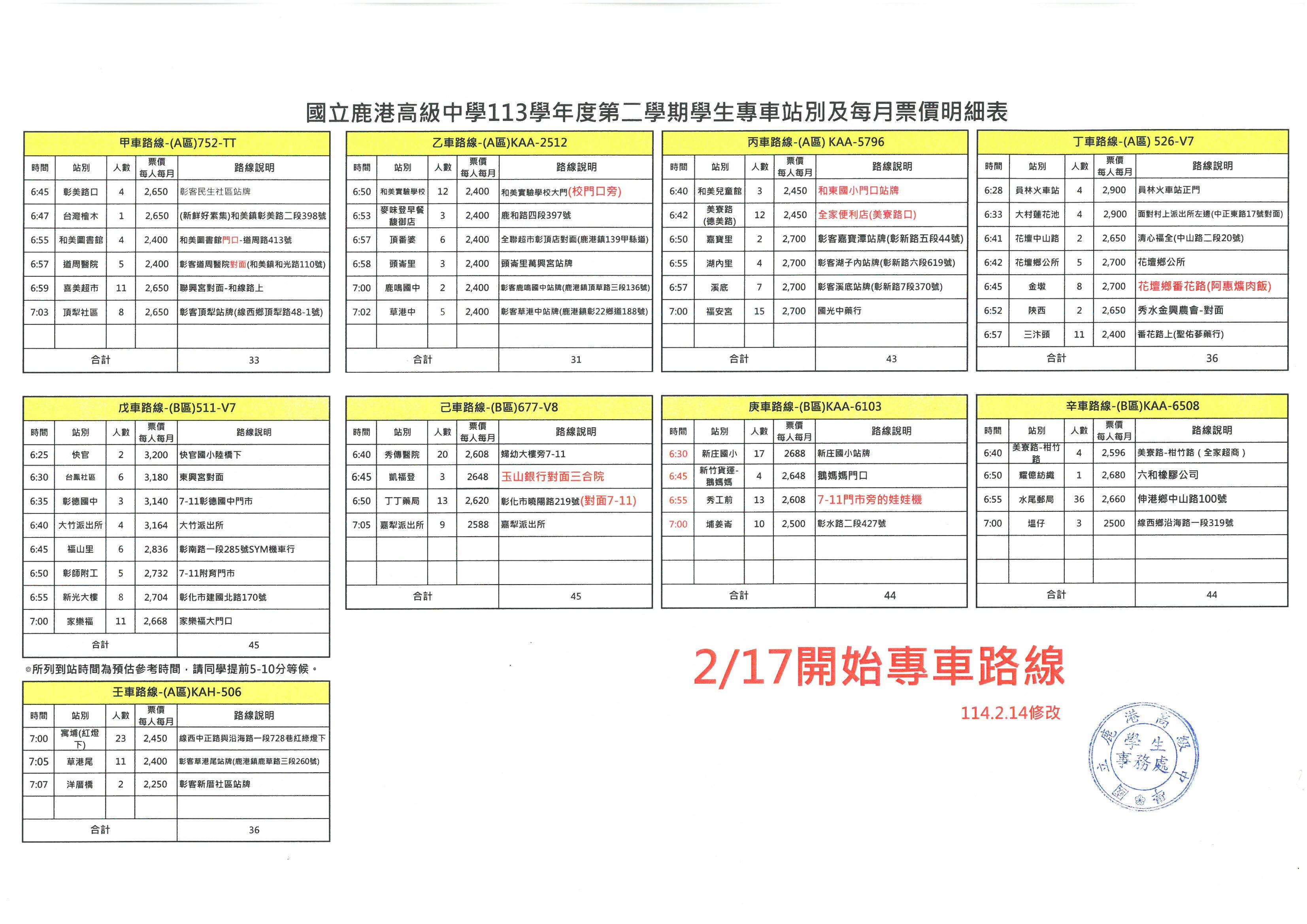 1、113學年度第2學期學生專車路線、發車時間及座位表,如附件。