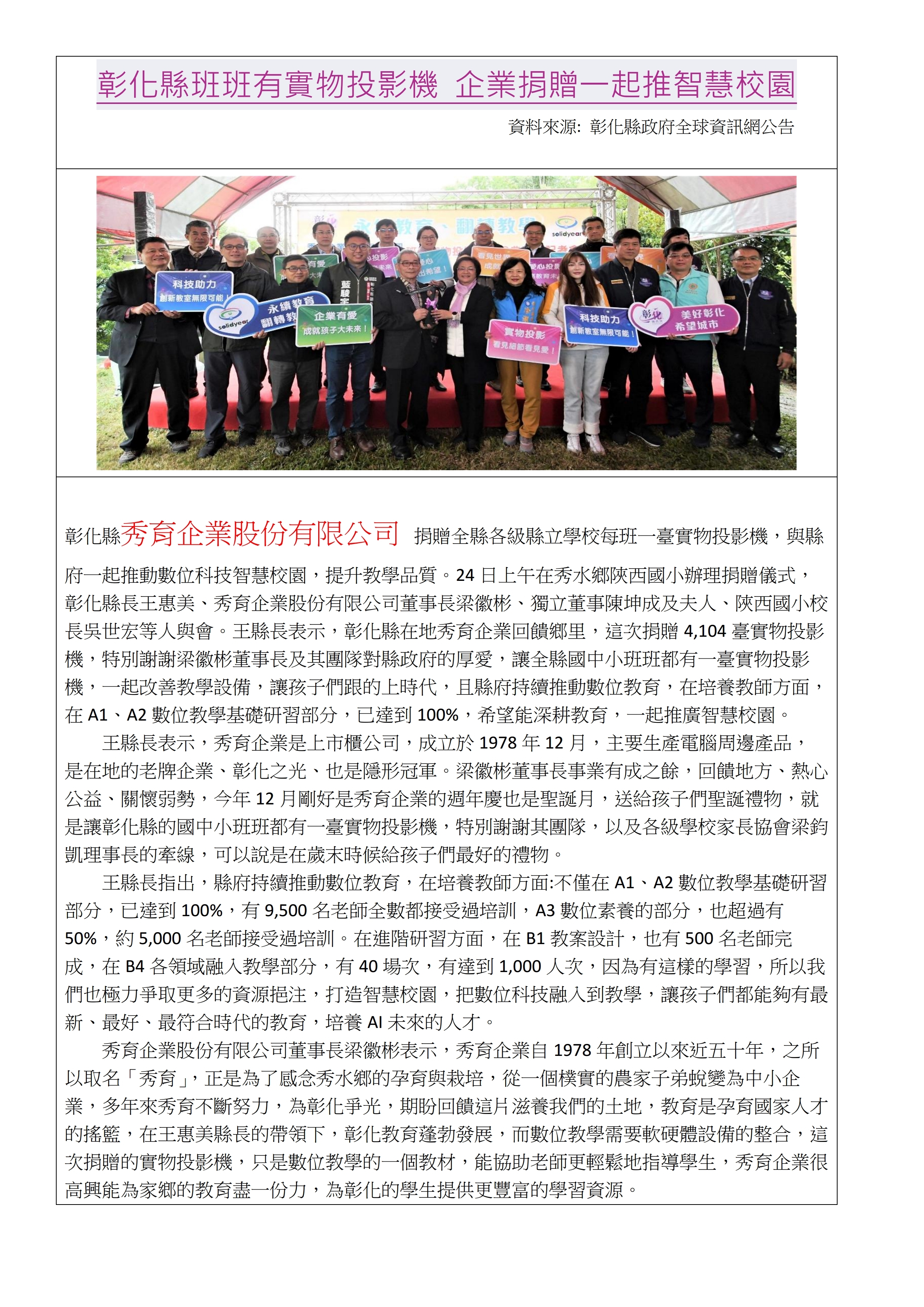 好消息!! 秀育企業股份有限公司捐贈40台實物投影機,充實本校多元教學設備,嘉惠學子