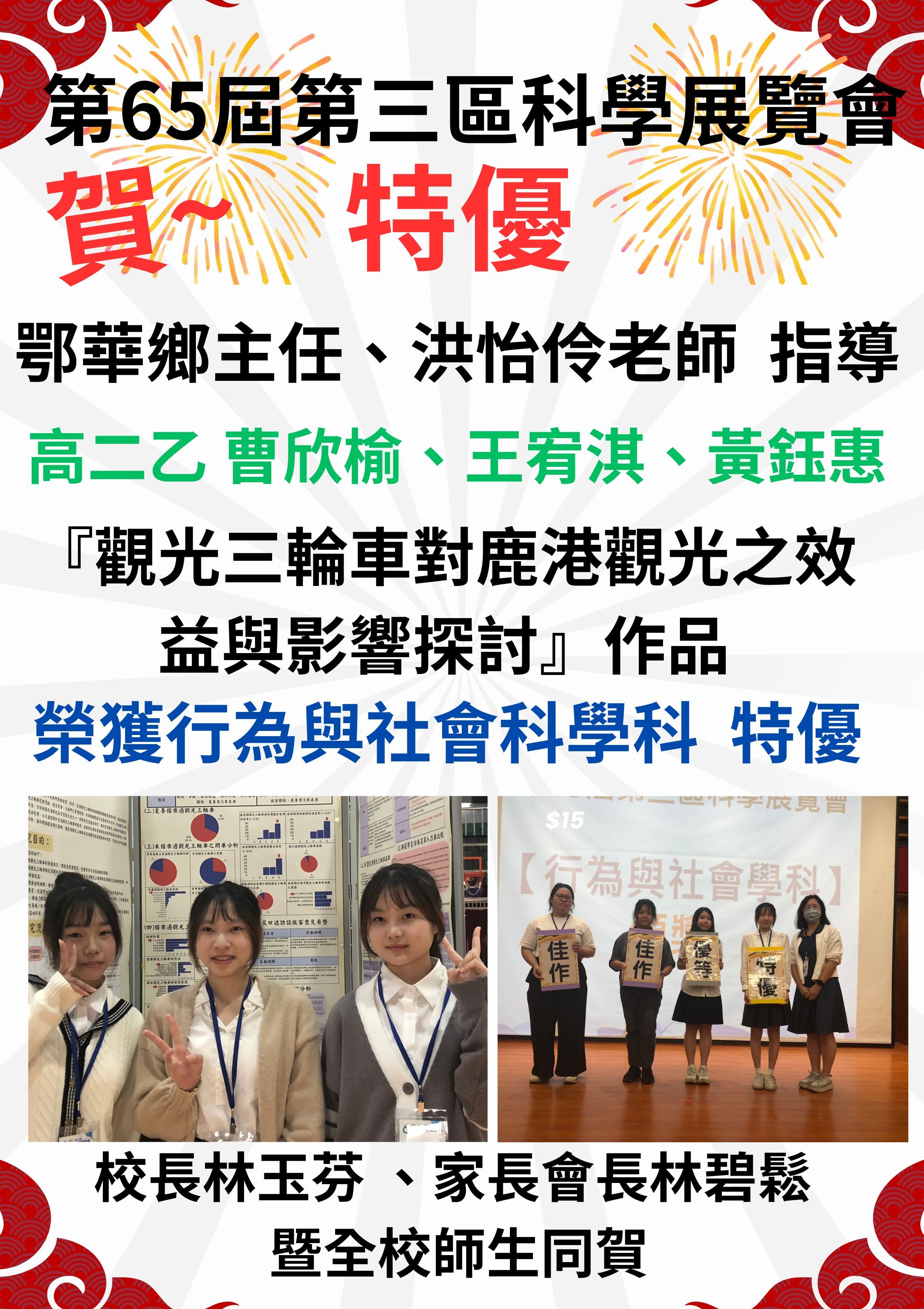 「觀光三輪車對鹿港觀光之效益與影響探討」 榮獲 「行為與社會科學科」特優獎,為本校爭光,展現優秀的科研素養與社會關懷。