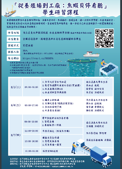 關教育部促進產學連結合作育才平臺-國立高雄科技大學執行辦公室與國立嘉義大學水生生物科學系共同辦理「從養殖場到工廠:魚蝦貝停看聽」學生研習課程,敬請協助公告,邀請貴校學生踴躍報名參加,請查照。
