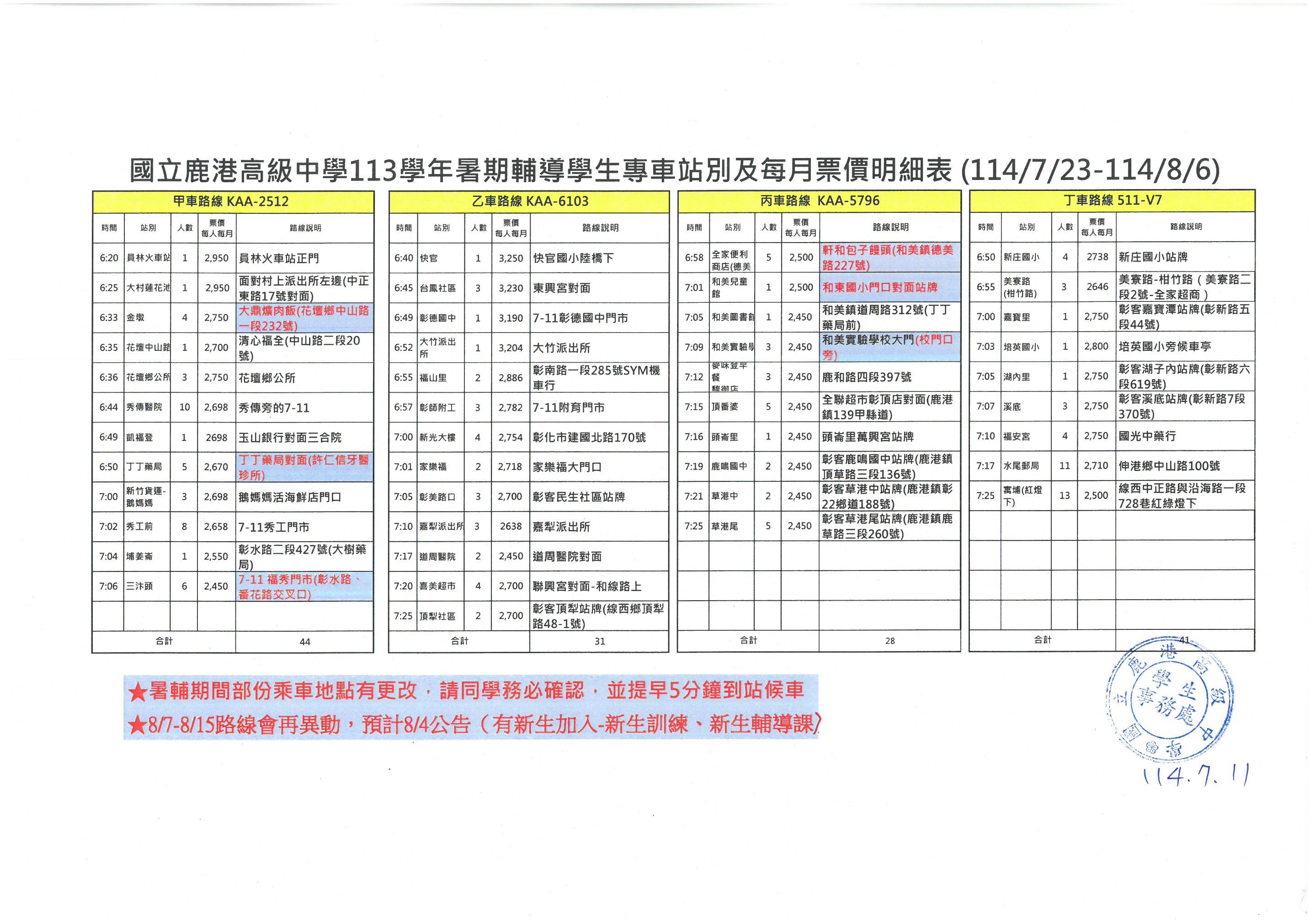 1、113學年度暑期輔導學生專車路線、各站發車時間及座位表,如附件