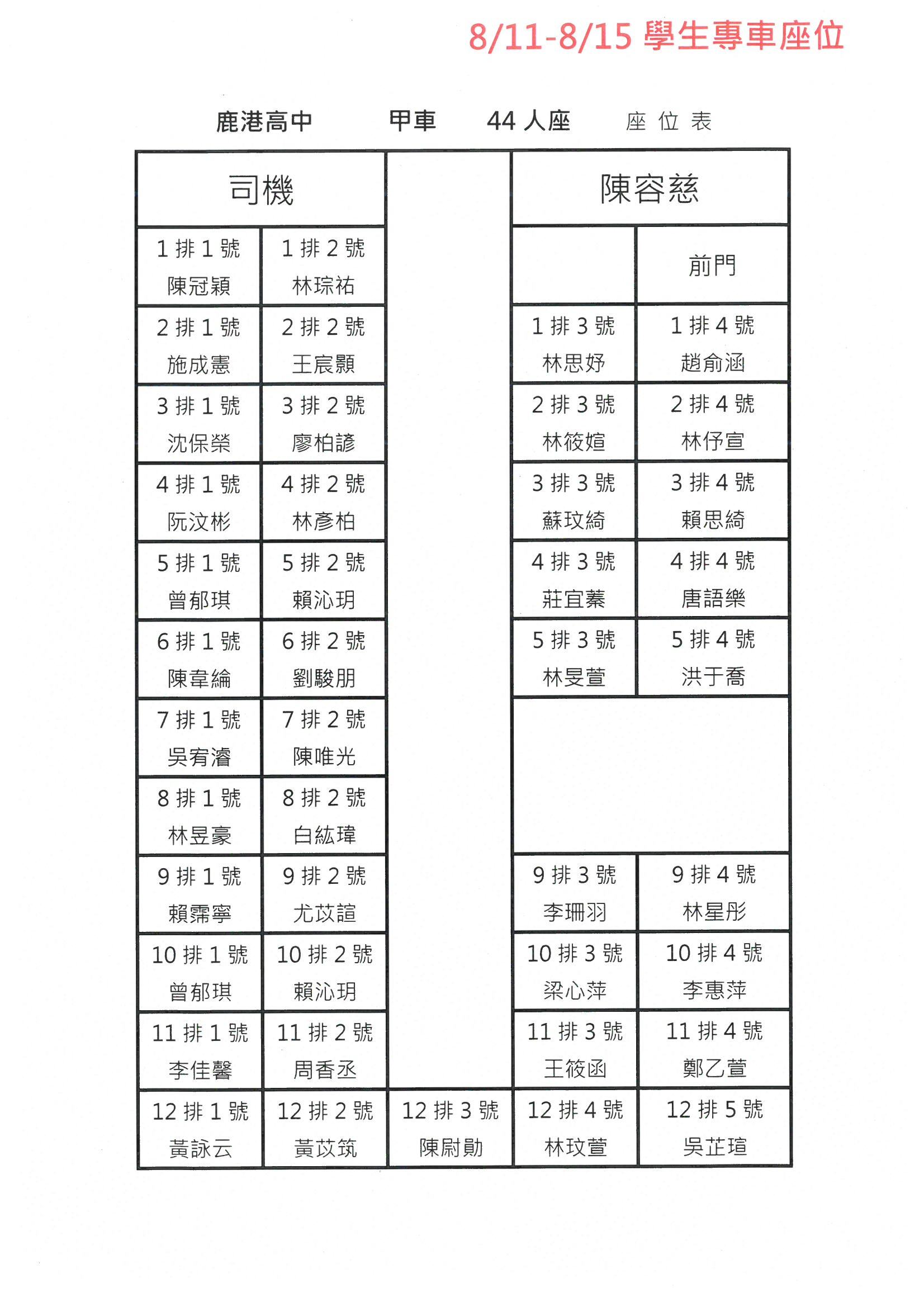 1、114/8/11-114/8/15學生專車為6台,請同學務必詳加確認自己搭乘的車次,並請提早3-5分鐘到站候車