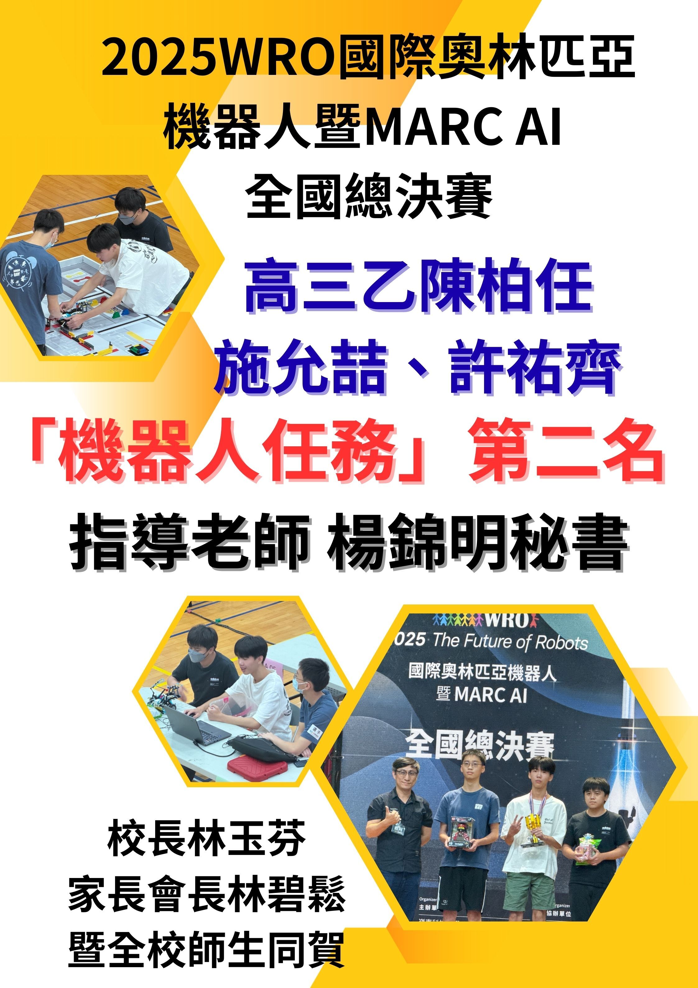賀!! 楊錦明秘書指導高三乙陳柏任、許祐齊、施允喆同學參加「2025WRO國際奧林匹亞機器人暨MARC AI 全國總決賽」榮獲機器人任務第二名。