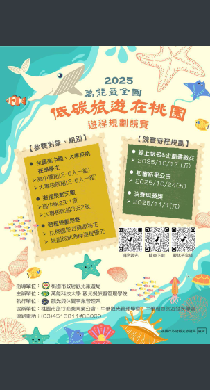 萬能科技大學觀光與休閒事業管理系舉辦「2025萬能盃全國『低碳旅遊在桃園』遊程規劃競賽」,鼓勵同學踴躍參加。
