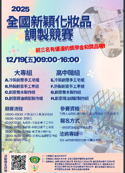 萬能科技大學辦理「2025全國新穎化妝品調製競賽」,邀請全國大專校院及高中職/五專三年級以下(含)在校生報名參加, 詳如說明。