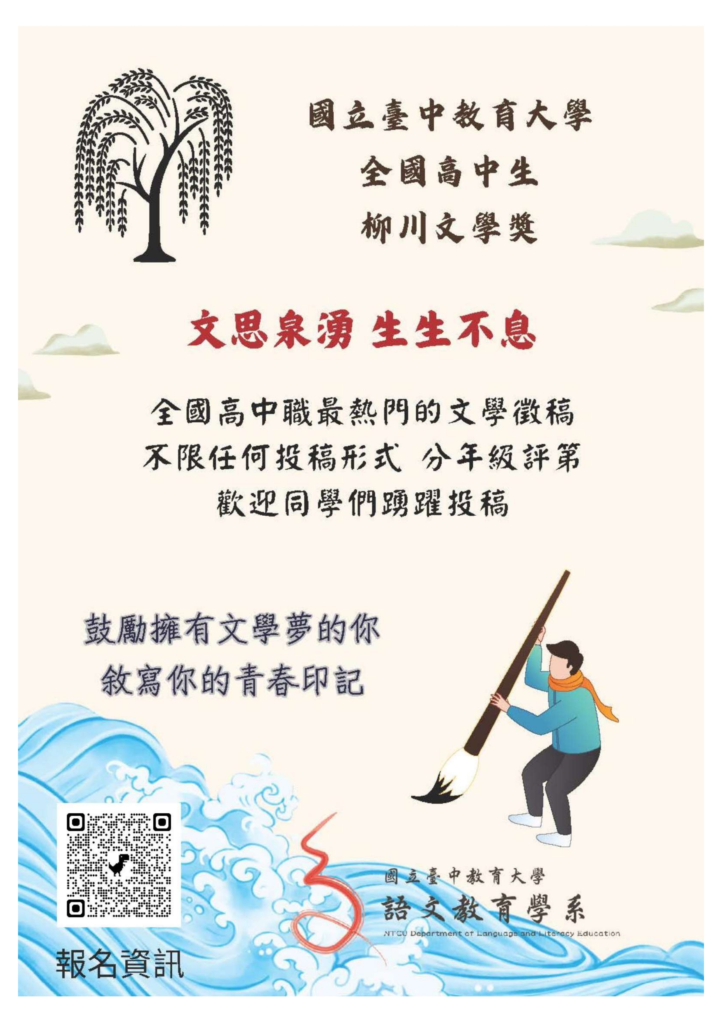 主旨: 為獎勵文學創作,培育優秀寫作人才,本校語文教育學系辦理「2026國立臺中教育大學語文教育學系高中生柳川散文獎」,請轉知所屬並鼓勵踴躍投稿,請查照。
