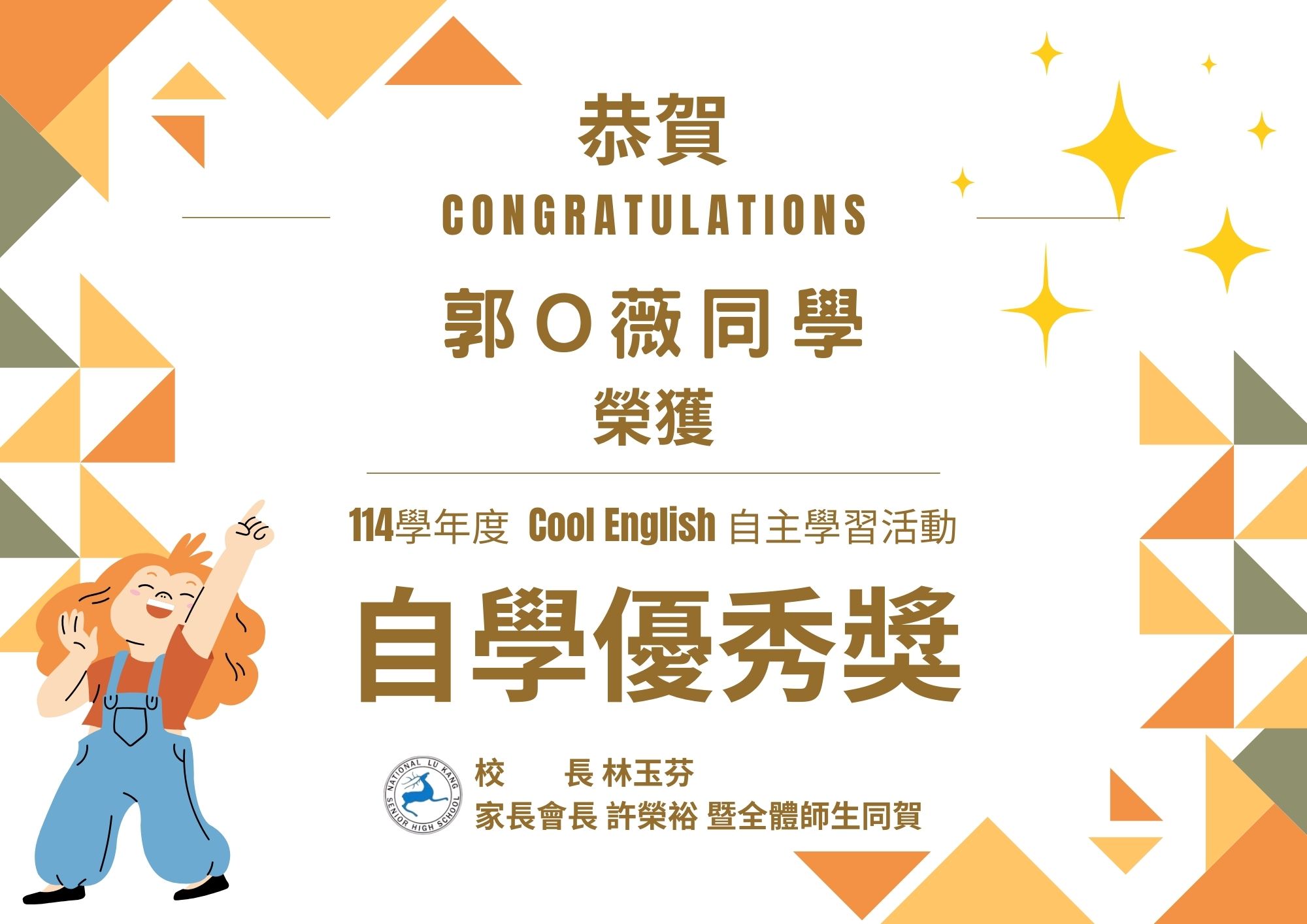 恭賀 郭O薇同學 榮獲114學年度 Cool English 自主學習活動自學優秀獎