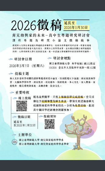 一、活動宗旨:邀請對人文與社會議題有興趣的高中職學生,分享課程專題或研究小論文的成果,讓年輕學子能在公開舞台上展現學習成果與想法,並透過交流拓展學習視野。本活動引導參與的高中職學生更深入了解「幼兒發展與教育」和「家庭生活與教育」領域的特色,以及相關社會議題的實務現況及研究趨勢,希冀透過此平台引導高中職學生認識專業領域。