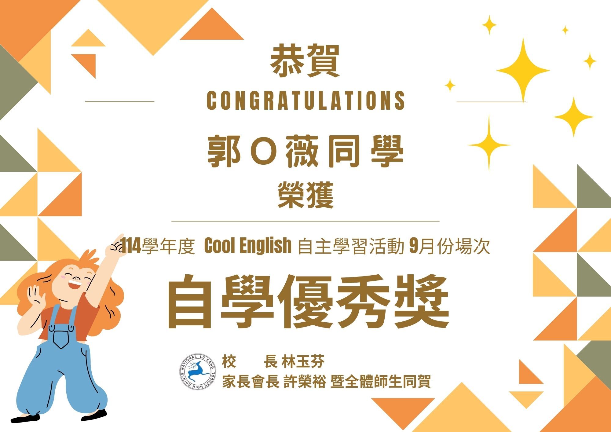 恭賀 本校郭O薇同學 榮獲「114學年度 Cool English 自主學習活動9月份場次」自學優秀獎