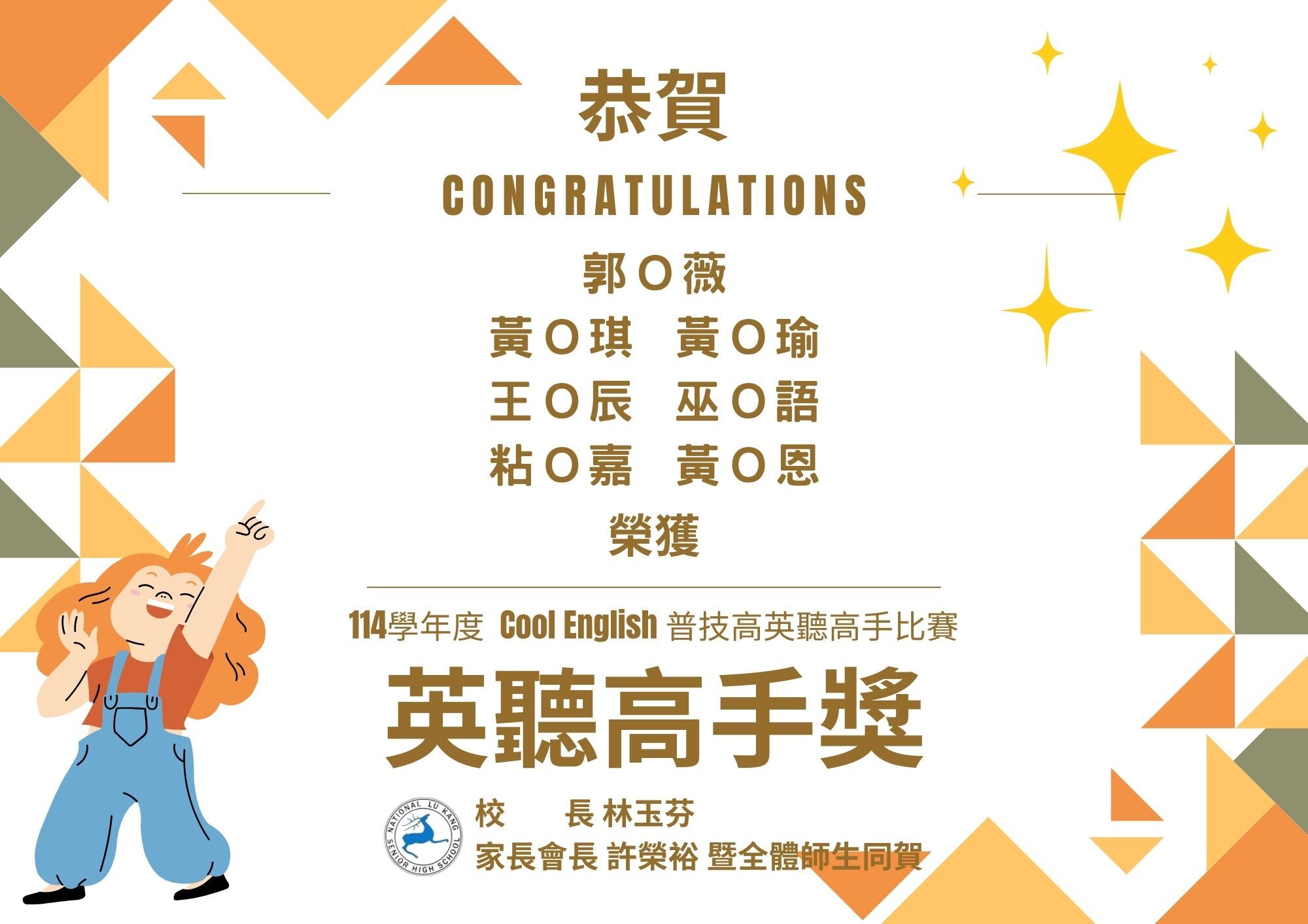 恭賀 本校 郭O薇 黃O琪 黃O瑜 王O辰 巫O語 粘O嘉 黃O恩同學 榮獲「114學年度 Cool English 普技高英聽高手比賽」英聽高手獎