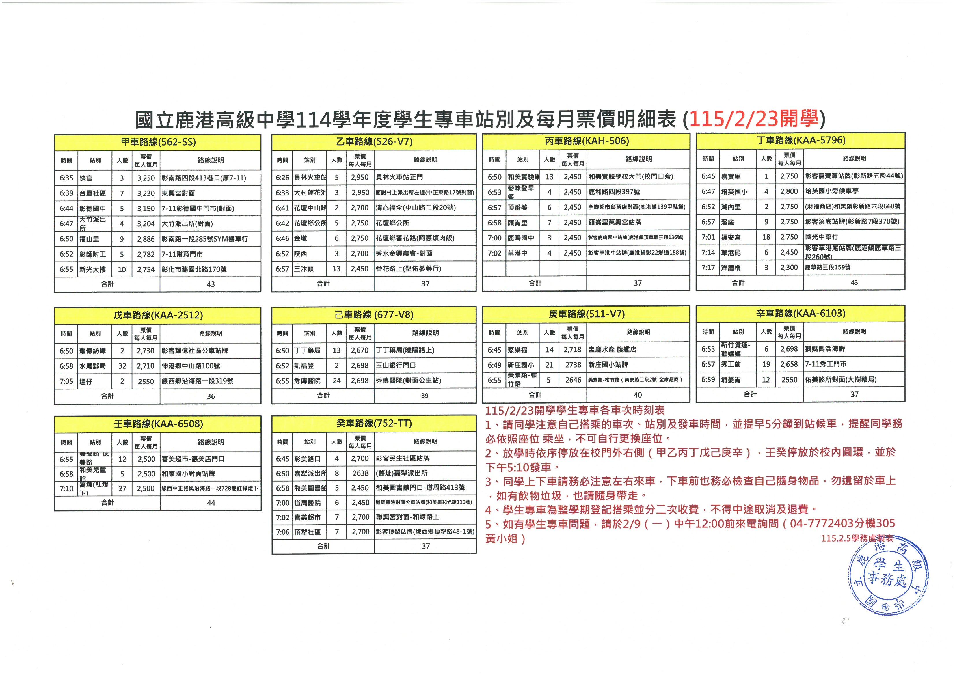 1、114學年度第二學期學生專車共有10條路線,請同學務必詳閱自己搭乘路線、車次、站別及座位表,提醒同學提早5-10分鐘到站候車。