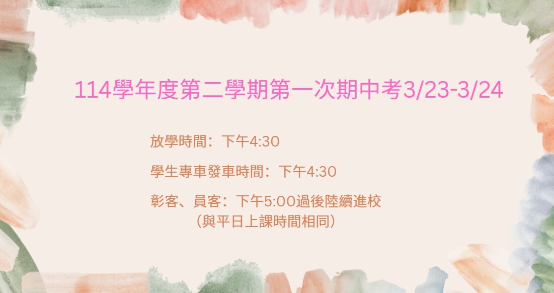 【放學時間公告】114學年度第二學期第一次期中考(3/23-3/24)下午4:30放學