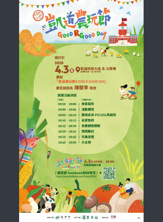 為推廣國產農漁畜產品並提升產業競爭力,農業部規劃115年4月3日(星期五)於總統府前凱達格蘭大道與北廣場舉辦「凱道農玩節」活動,以「台灣農產唯一選擇!」為核心,將凱道轉化為親子農玩樂園,藉由食農教育體驗活動,深化國人對本土農業的認同與支持。