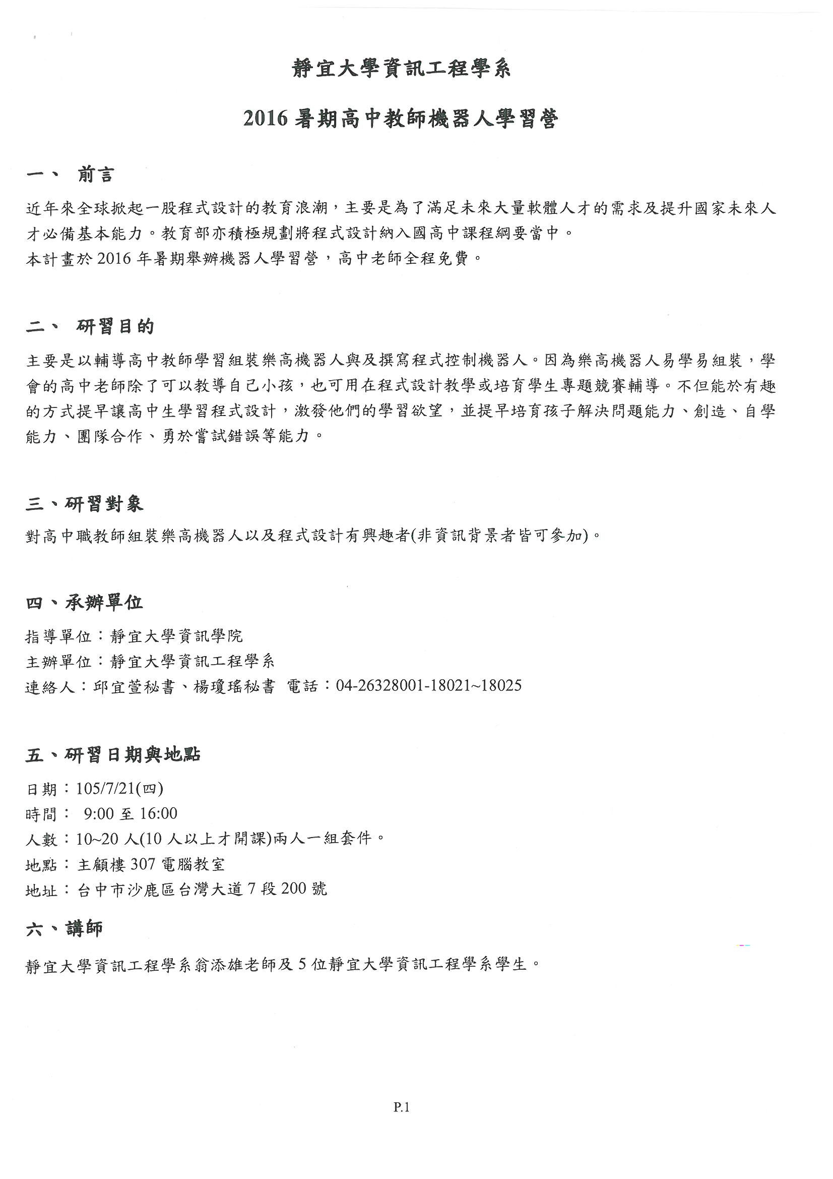 【靜宜大學】2016暑期高中教師機器人學習營~歡迎老師報名參加
