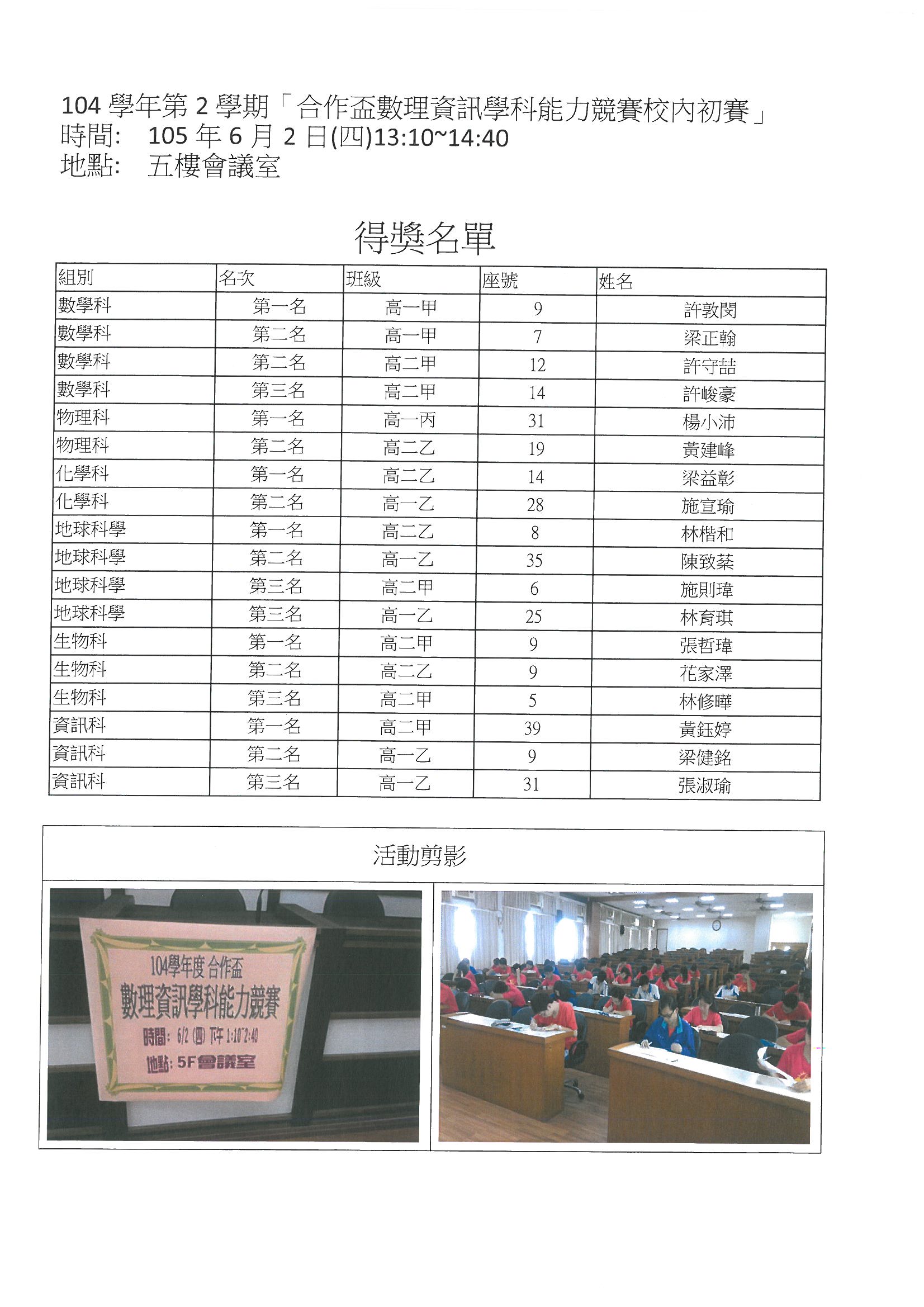 104年度合作盃數理資訊學科能力競賽校內初賽~成績公布